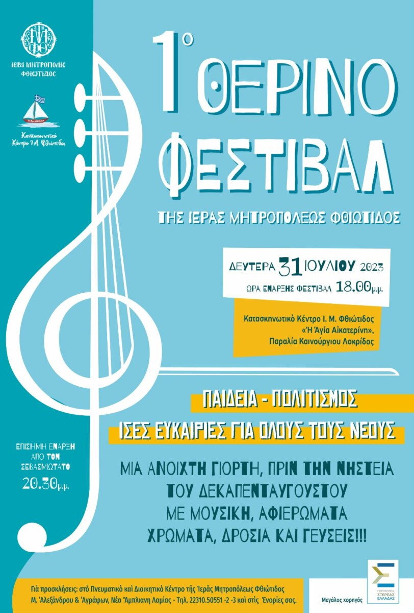 Η Ιερά Μητρόπολη Φθιώτιδος σας προσκαλεί στο 1ο ΘΕΡΙΝΟ ΦΕΣΤΙΒΑΛ, το οποίο θα πραγματοποιηθεί στο παραθαλάσσιο και δροσερό Κατασκηνωτικό Κέντρο «Η ΑΓΙΑ ΑΙΚΑΤΕΡΙΝΗ» στην παραλία στο Καινούργιο Λοκρίδος την ΔΕΥΤΕΡΑ 31 ΙΟΥΛΙΟΥ 2023 από τις 18.00 μ.μ. έως τα μεσάνυχτα.