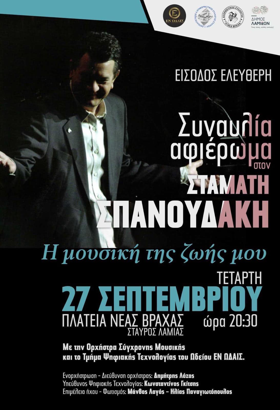Ο Εξωραϊστικός Σύλλογος «Η ΝΕΑ ΒΡΑΧΑ», ο Πολιτιστικός Σύλλογος Σταυρού και το Ωδείο ΕΝ ΩΔΑΙΣ σε συνεργασία με το Δήμο Λαμιέων, διοργανώνουν συναυλία αφιέρωμα στον σημαντικό Έλληνα μουσικοσυνθέτη Σταμάτη Σπανουδάκη.
