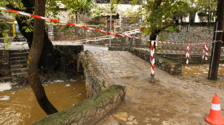 Το ποτάμι της Έρκυνας φούσκωσε επικίνδυνα στις πηγές της Κρύας, προκαλώντας ζημιές σε ένα από τα πανέμορφα πέτρινα γεφύρια του και φθορές στα ξύλινα γεφυράκια.