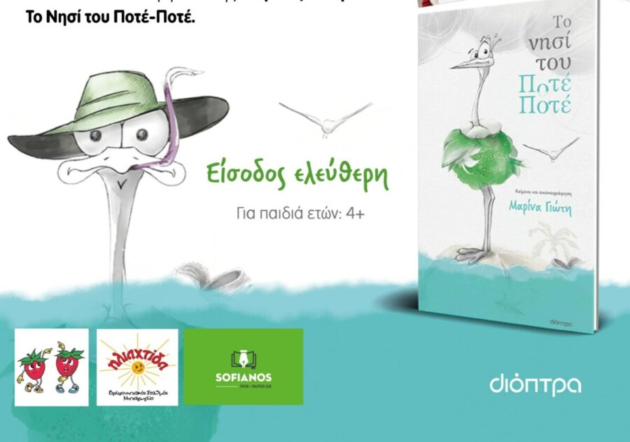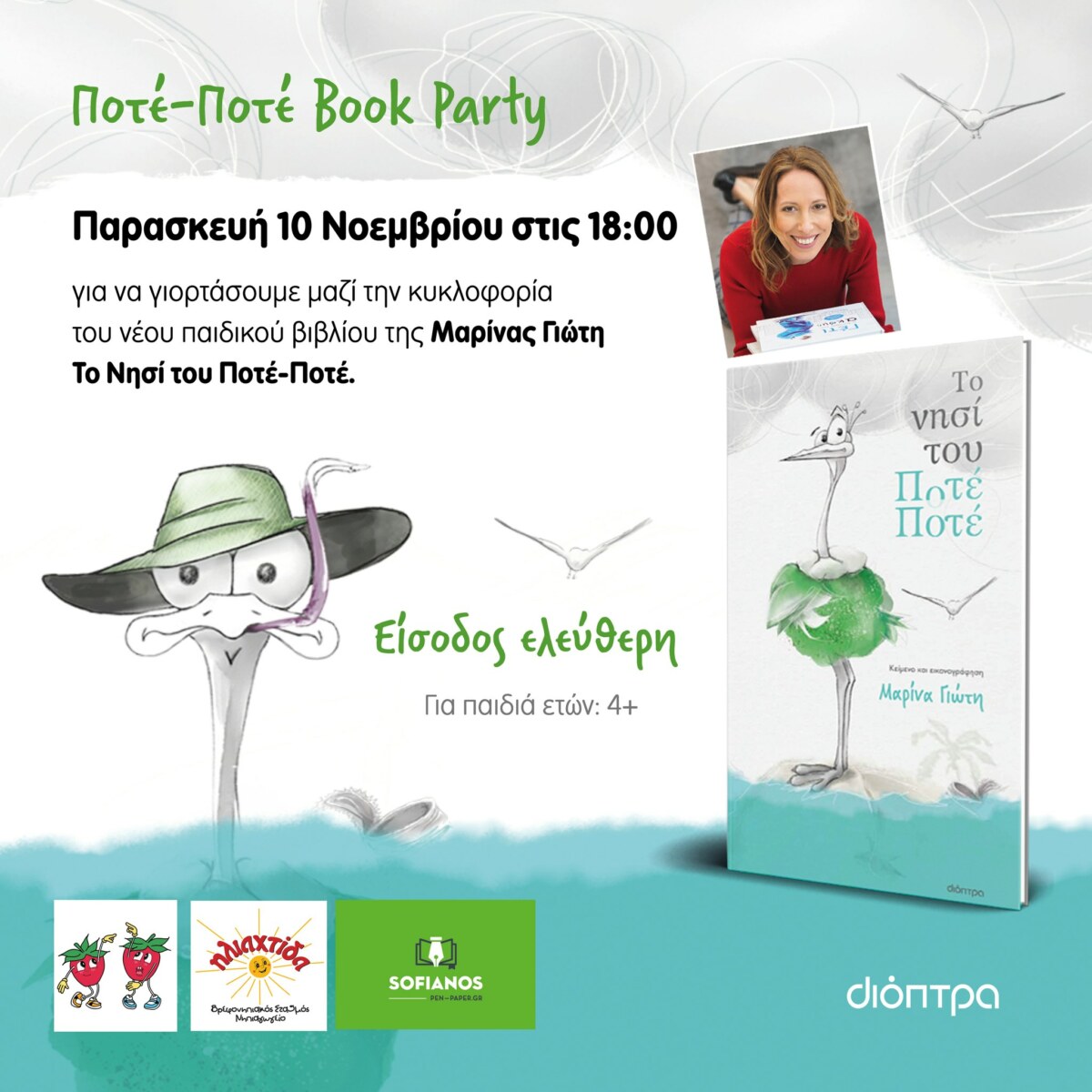 Το βιβλιοπωλείο SOFIANOS, ο βρεφονηπιακός σταθμός – νηπιαγωγείο “Γελαστή Φράουλα”, ο βρεφονηπιακός σταθμός – νηπιαγωγείο “Ηλιαχτίδα” και οι εκδόσεις “Διόπτρα” σας προσκαλούν σε ένα διασκεδαστικό διαδραστικό βιβλιοπάρτυ, για να γιορτάσουμε μαζί την κυκλοφορία του νέου παιδικού βιβλίου της Μαρίνας Γιώτη Το Νησί του Ποτέ-Ποτέ.