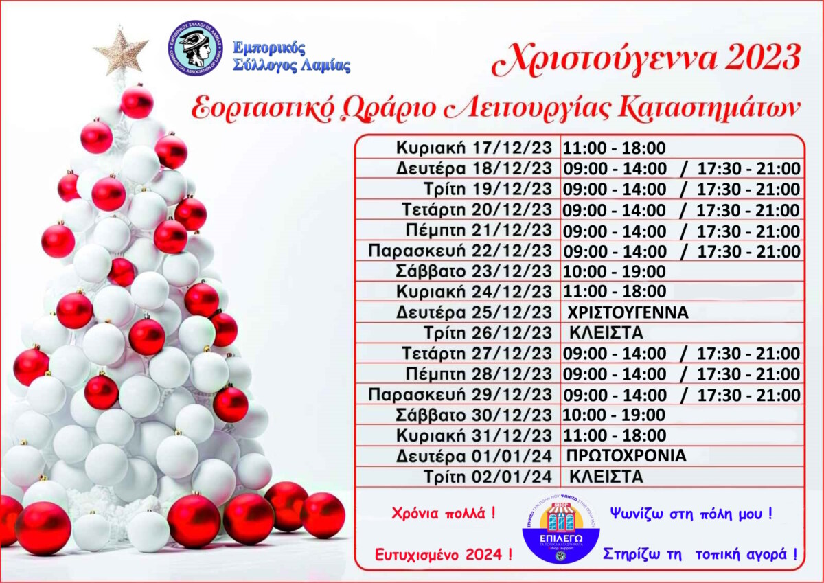 Με γνώμονα την εύρυθμη λειτουργία της αγοράς την περίοδο των γιορτών ο Εμπορικός Σύλλογος Λαμίας ανακοίνωσε το παρακάτω προτεινόμενο ωράριο.