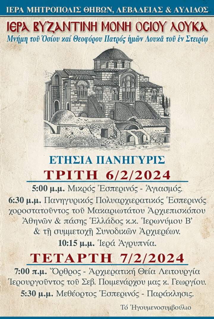 Σύμφωνα με δελτίο τύπου ανακοινώνεται το πρόγραμμα εορτασμού στην Ιερά Βυζαντινή Μονή Οσίου Λουκά.
