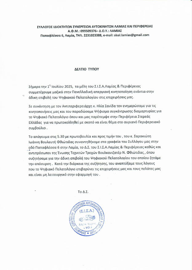 Οι ιδιοκτήτες συνεργείων αυτοκινήτων Λαμίας και Περιφέρειας μετά τη συγκέντρωση διαμαρτυρίας στην πλατεία Ελευθερίας το πρωί της Τρίτης (01-07) και τη συμμετοχή στην πανελλαδική απεργιακή κινητοποίηση, ενάντια στο νέο Ψηφιακό Πελατολόγιο της Ανεξάρτητης Αρχής Δημοσίων Εσόδων, συναντήθηκαν με τον Αντιπεριφερειάρχη, Ηλία Σανίδα.