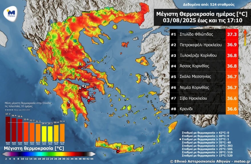 Στον χάρτη που ακολουθεί παρουσιάζεται η κατανομή της μέγιστης θερμοκρασίας στη χώρα καθώς και οι 8 σταθμοί με τις υψηλότερες μέγιστες.