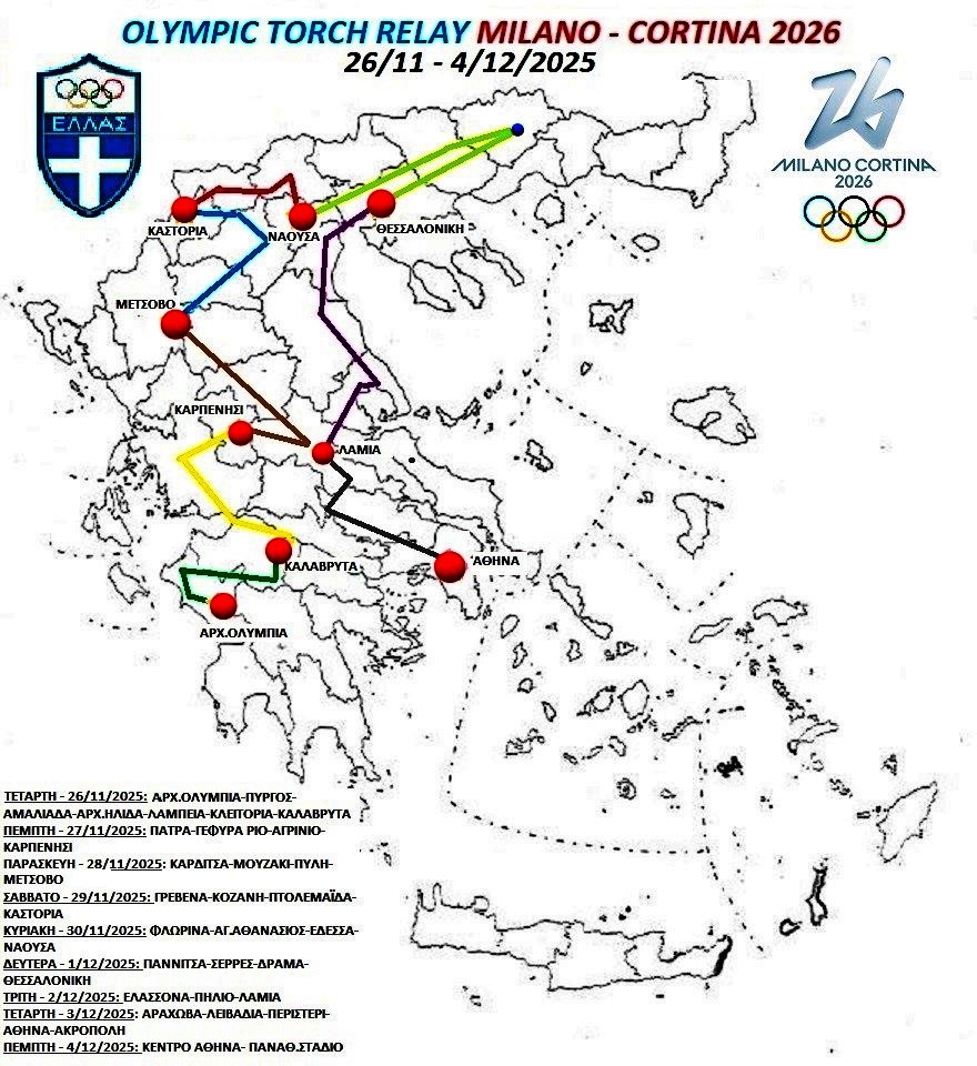 Η Ολυμπιακή Φλόγα θα γεννηθεί στην Αρχαία Ολυμπία στις 26 Νοεμβρίου, θα ακολουθήσει Λαμπαδηδρομία 9 ημερών καλύπτοντας 2.200 χιλιόμετρα, 23 νομούς και 7 περιφέρειες, με 36 τελετές υποδοχής σε όλη τη χώρα και θα παραδοθεί στις 4 Δεκεμβρίου, στο Παναθηναϊκό Στάδιο, στην αντιπροσωπεία της Οργανωτικής Επιτροπής των Χειμερινών Ολυμπιακών Αγώνων του 2026, για να αναχωρήσει για την Ιταλία.