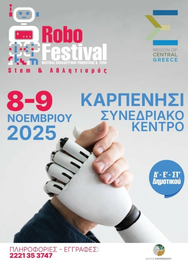 Η Περιφέρεια Στερεάς Ελλάδας σε συνεργασία με τον Δήμο Καρπενησίου διοργανώνει το 5ο Φεστιβάλ Εκπαιδευτικής Ρομποτικής «RoboFestival STEM | Robotics – Coding – Engineering – Maths», που θα λάβει χώρα στις 8 και 9 Νοεμβρίου 2025, στο Συνεδριακό Κέντρο Καρπενησίου.