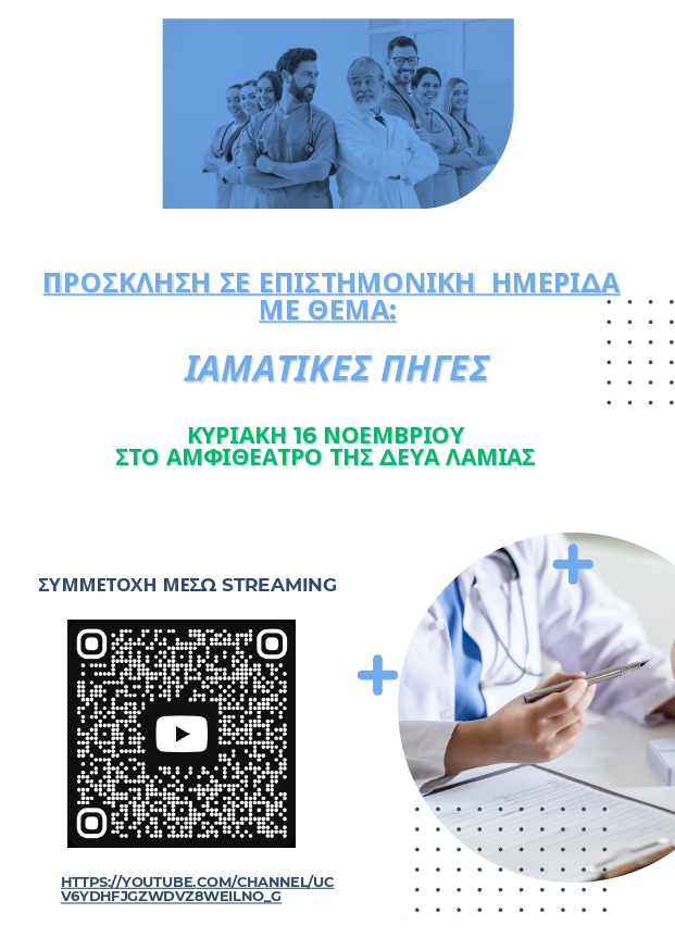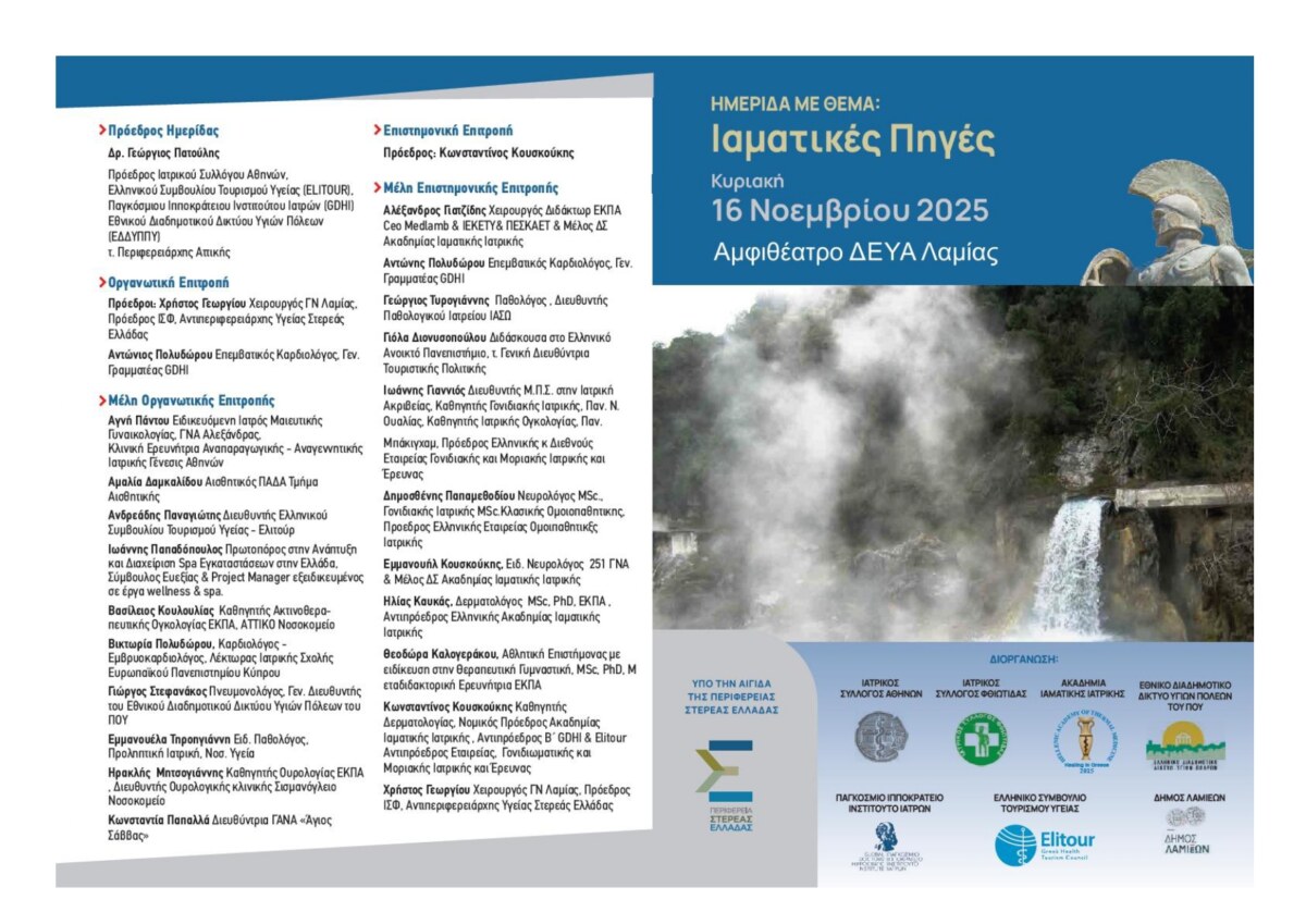 Ο Ιατρικός Σύλλογος Φθιώτιδας διοργανώνει ημερίδα με θέμα “Ιαματικές πηγές στη Φθιώτιδα”. Η εκδήλωση θα πραγματοποιηθεί την Κυριακή 16 Νοεμβρίου 2025 στο Αμφιθέατρο της ΔΕΥΑΛ.