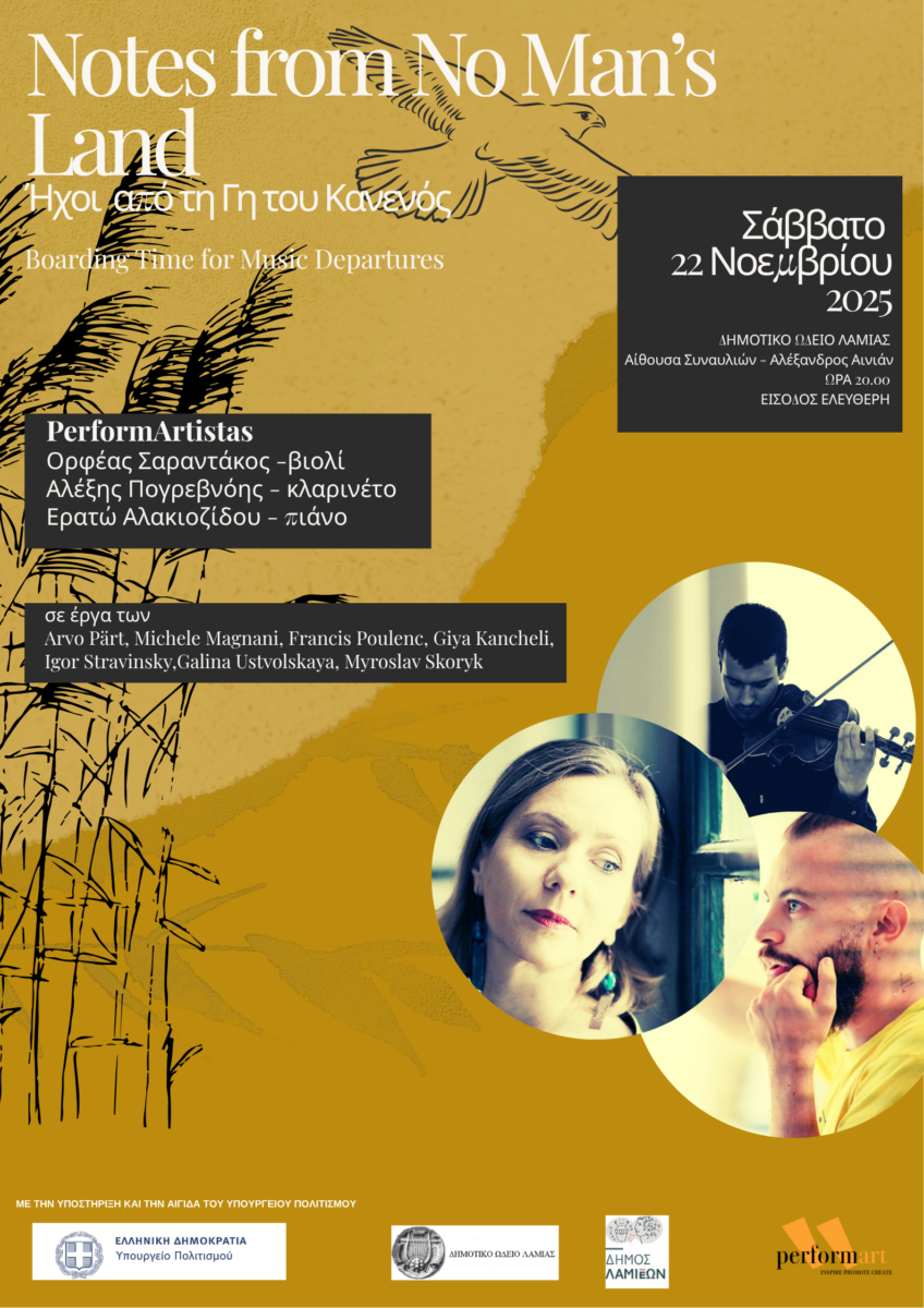Ο Δήμος Λαμιέων και το Δημοτικό Ωδείο Λαμίας σε συνεργασία με την Performart το Σάββατο 22 Νοεμβρίου 2025 και ώρα 20:00 παρουσιάζει στην αίθουσα συναυλιών «Αλέξανδρος Αινιάν» το μουσικό πρόγραμμα «Notes from No Man’s Land: Boarding Time for Music Departures», έναν κύκλο συναυλιών αφιερωμένο στη σύγχρονη μουσική δημιουργία και στις πολιτιστικές διαδρομές που ενώνουν διαφορετικούς τόπους και εποχές μέσα από τον ήχο.