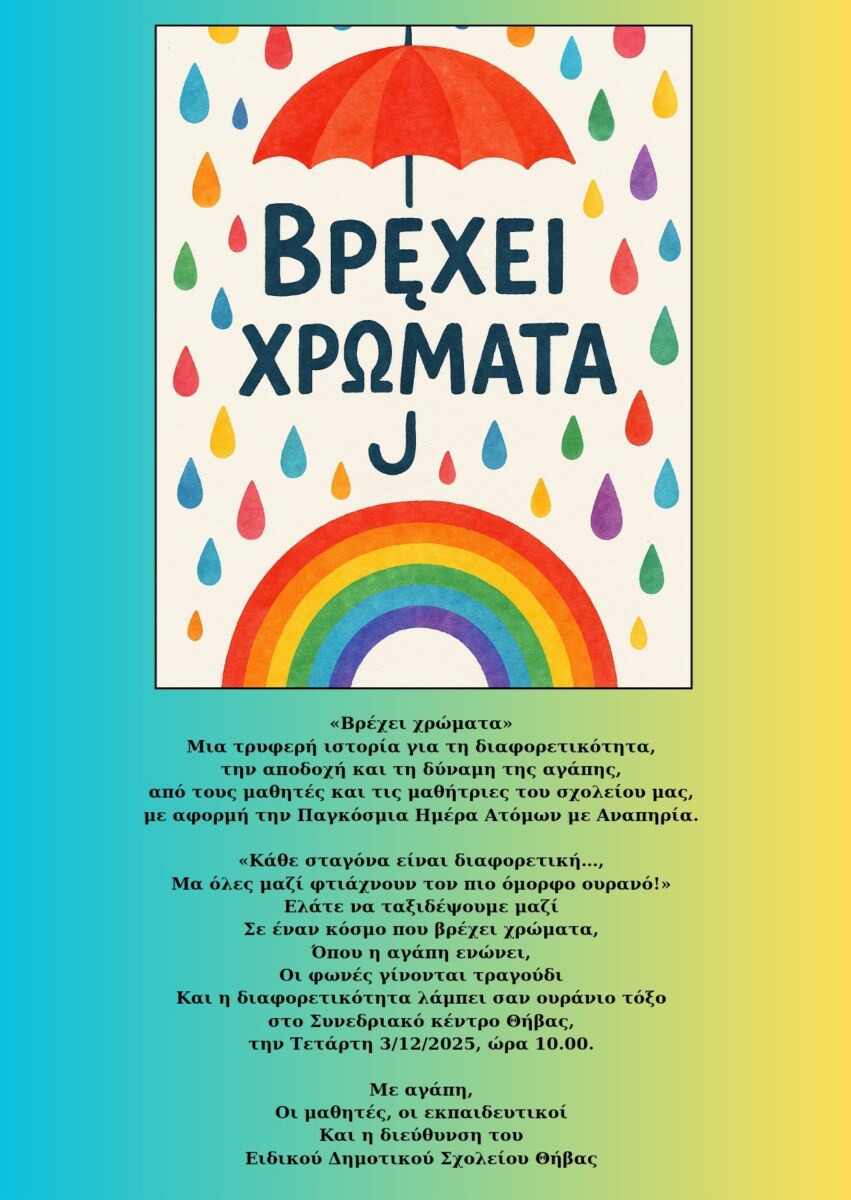 Το Ειδικό Δημοτικό Σχολείο Θήβας σας προσκαλεί στη γιορτή για την Παγκόσμια Ημέρα ΑμΕΑ. Παρακαλούμε εκτός από την καλή σας διάθεση να φέρετε μαζί σας την ομπρέλα σας, γιατί στο φινάλε της παράστασης θα βρέξει χρώματα.