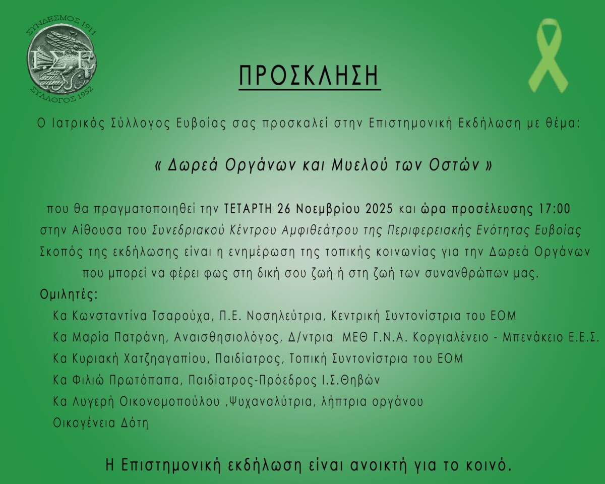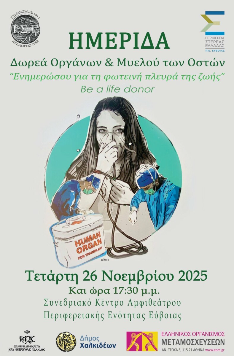 Εκδήλωση με θέμα «Δωρεά Οργάνων και Μυελού των Οστών» πραγματοποιεί σήμερα ο Ιατρικός Σύλλογος Ευβοίας. Η εκδήλωση υλοποιείται με την συνεργασία της Περιφέρειας Στερεάς και την υποστήριξη της Ιεράς Μητρόπολης Χαλκίδας, του Δήμου Χαλκιδαίων και του Ελληνικού Οργανισμού Μεταμοσχεύσεων στην αίθουσα του Αμφιθεάτρου της Περιφερειακής Ενότητας Εύβοιας στη Χαλκίδα, στις 5.00 μ.μ.