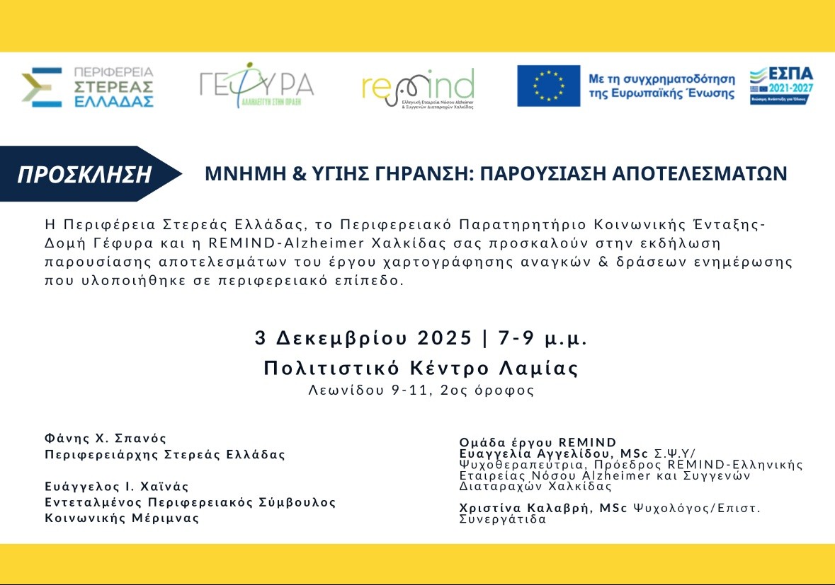 Η Περιφέρεια Στερεάς Ελλάδας, το Περιφερειακό Παρατηρητήριο Κοινωνικής Ένταξης – Δομή «ΓΕΦΥΡΑ» και η Ελληνική Εταιρεία Νόσου Αlzheimer και Συγγενών Διαταραχών Χαλκίδας – REMIND, στην πορεία να κατανοήσουμε καλύτερα τις ανάγκες των ατόμων μεγαλύτερων ηλικιών αναφορικά με την προστασία της μνήμης και της ψυχικής υγείας, αφουγκραστήκαμε ιστορίες, ανησυχίες και ελπίδες των πολιτών από είκοσι επτά (27) περιοχές της Στερεάς Ελλάδας.