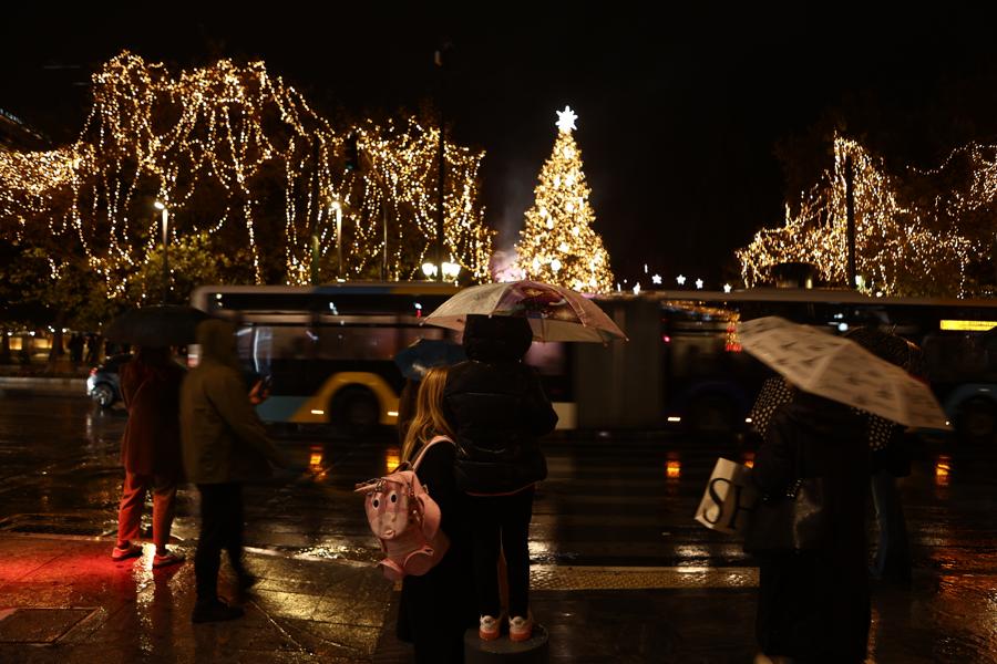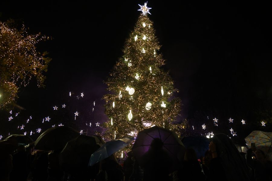 Σε εορταστικό κλίμα μπήκε η Αθήνα, με τον δήμαρχο Χάρη Δούκα να ανάβει το χριστουγεννιάτικο δέντρο στην πλατεία Συντάγματος υπό βροχή.