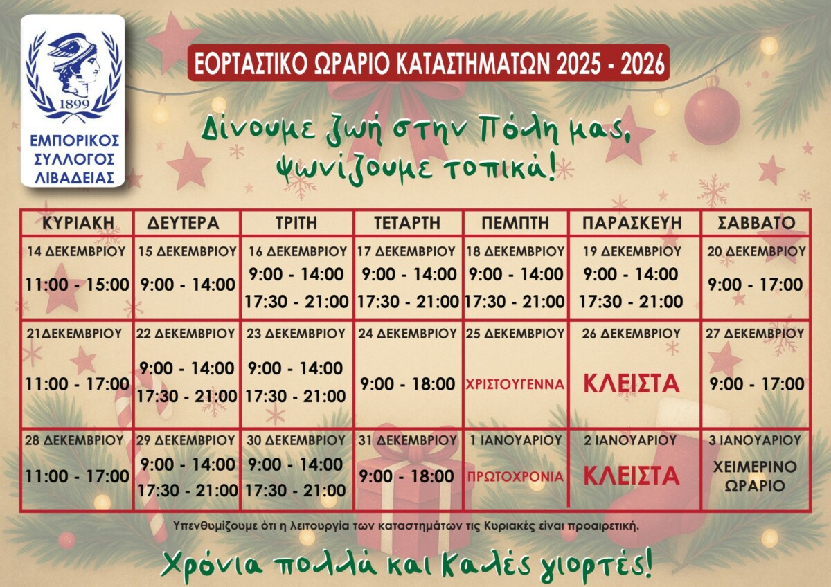 Ο Εμπορικός Σύλλογος Λιβαδειάς ανακοίνωσε το εορταστικό ωράριο λειτουργίας των καταστημάτων την περίοδο των Χριστουγέννων 2025.