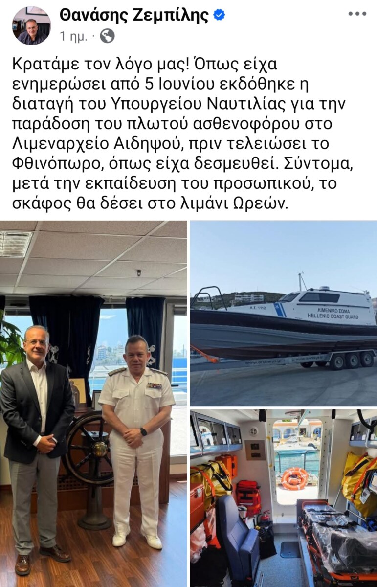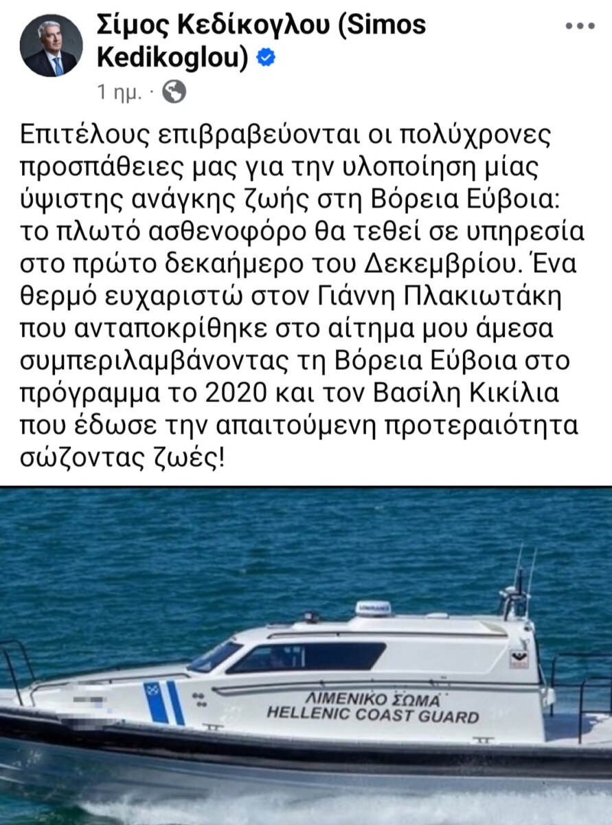 Ο Σίμος Κεδίκογλου επανήλθε στο θέμα με εκτενές κείμενο για όλες τις συναντήσεις και επαφές που είχε όλα αυτά τα χρόνια ώστε η Β. Εύβοια να αποκτήσει πλωτό ασθενοφόρο .