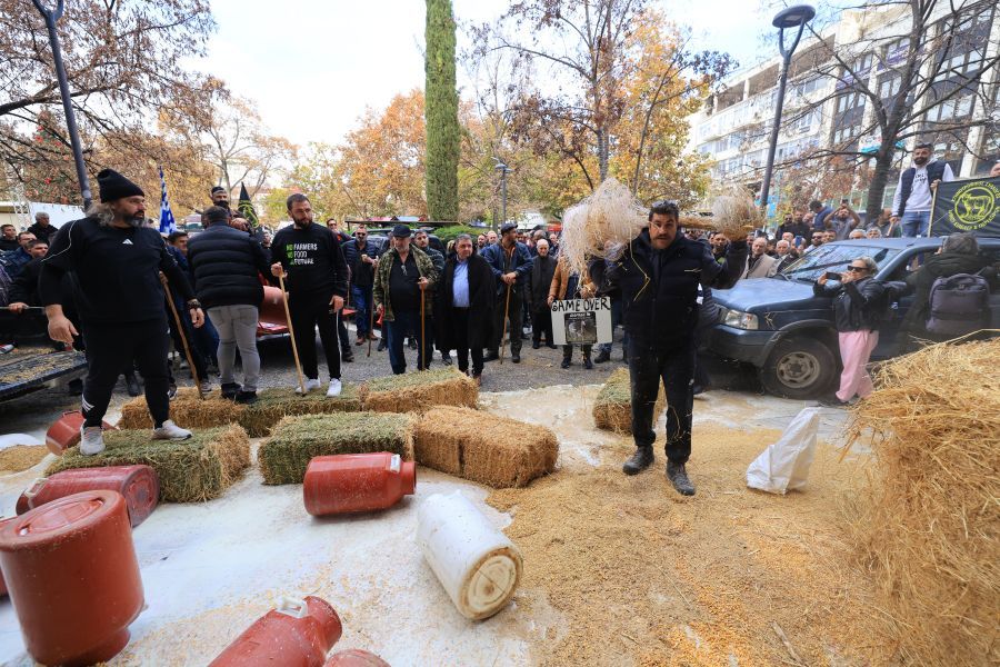 Οι αγρότες έχυσαν γάλατα στην πλατεία της πόλης και έριξαν άχυρα και καλαμπόκι.