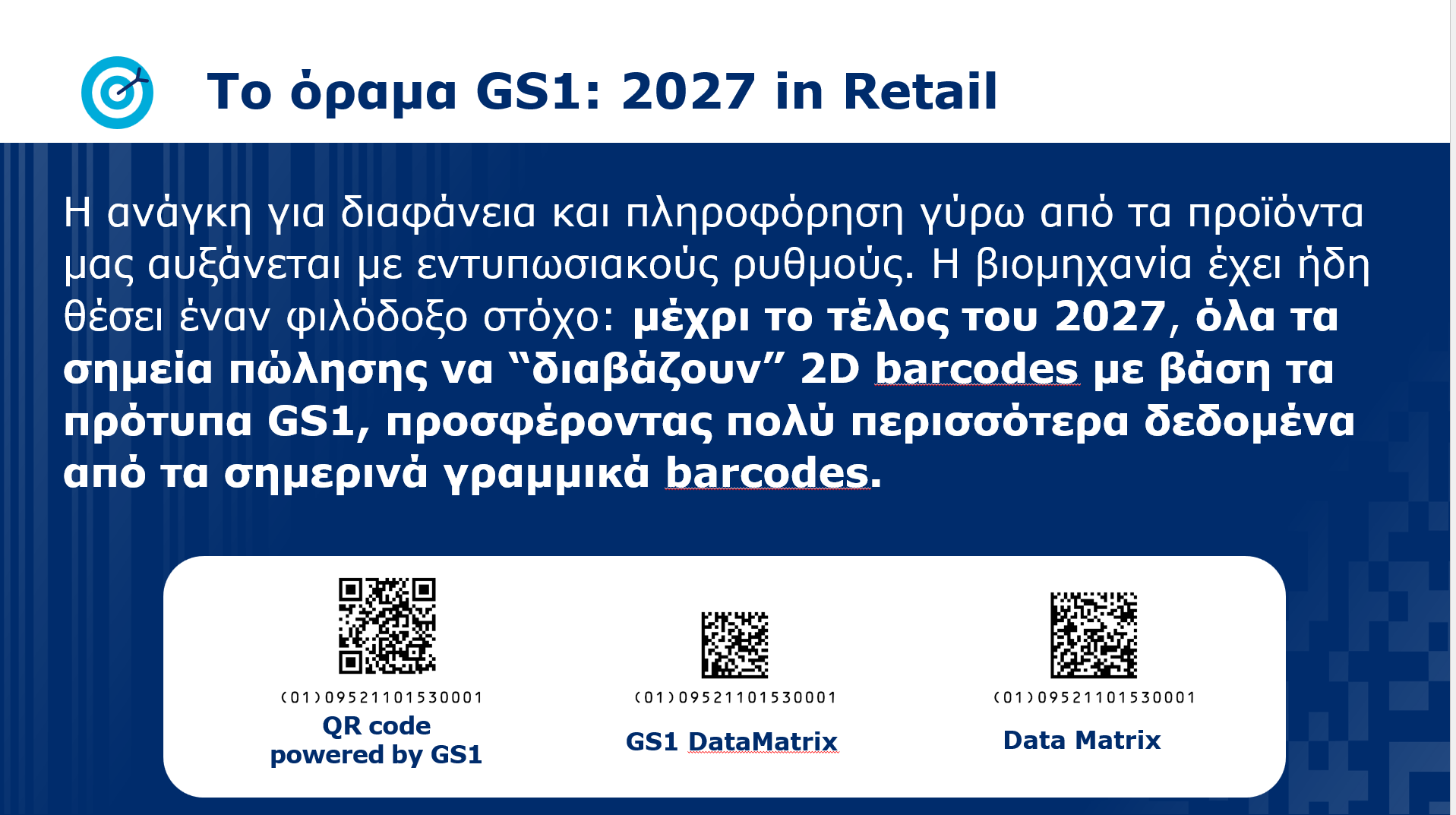 Το QR Code με GS1 Digital Link μπορεί έτσι και επεκτείνει τη συσκευασία του προϊόντος, εξοικονομώντας πολύτιμο χώρο, μιας και επιτρέπει σε κάθε προϊόν να «μιλά» ψηφιακά. Η βιομηχανία μάλιστα έχει ήδη θέσει ήδη έναν φιλόδοξο στόχο, μέχρι το τέλος του 2027, όλα τα σημεία πώλησης να “διαβάζουν” 2D barcodes με βάση τα πρότυπα GS1, προσφέροντας πολύ περισσότερα δεδομένα από τα σημερινά γραμμικά barcodes.