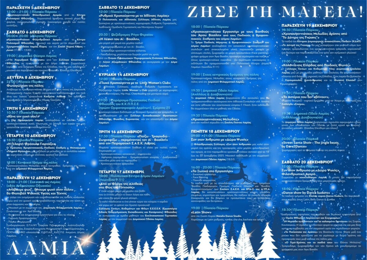 Ο Δήμος Λαμιέων καλωσορίζει την πιο μαγική εποχή του χρόνου μ΄ ένα πλούσιο πρόγραμμα Χριστουγεννιάτικων εκδηλώσεων που υπόσχεται να γεμίσει την πόλη μας φως, χαρά και γιορτινή διάθεση!
