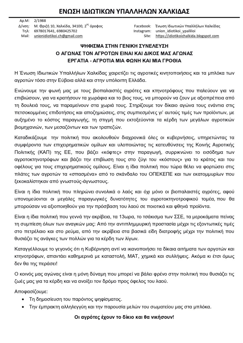 Η Ένωση Ιδιωτικών Υπαλλήλων Χαλκίδας στηρίζει τον αγώνα των αγροτών