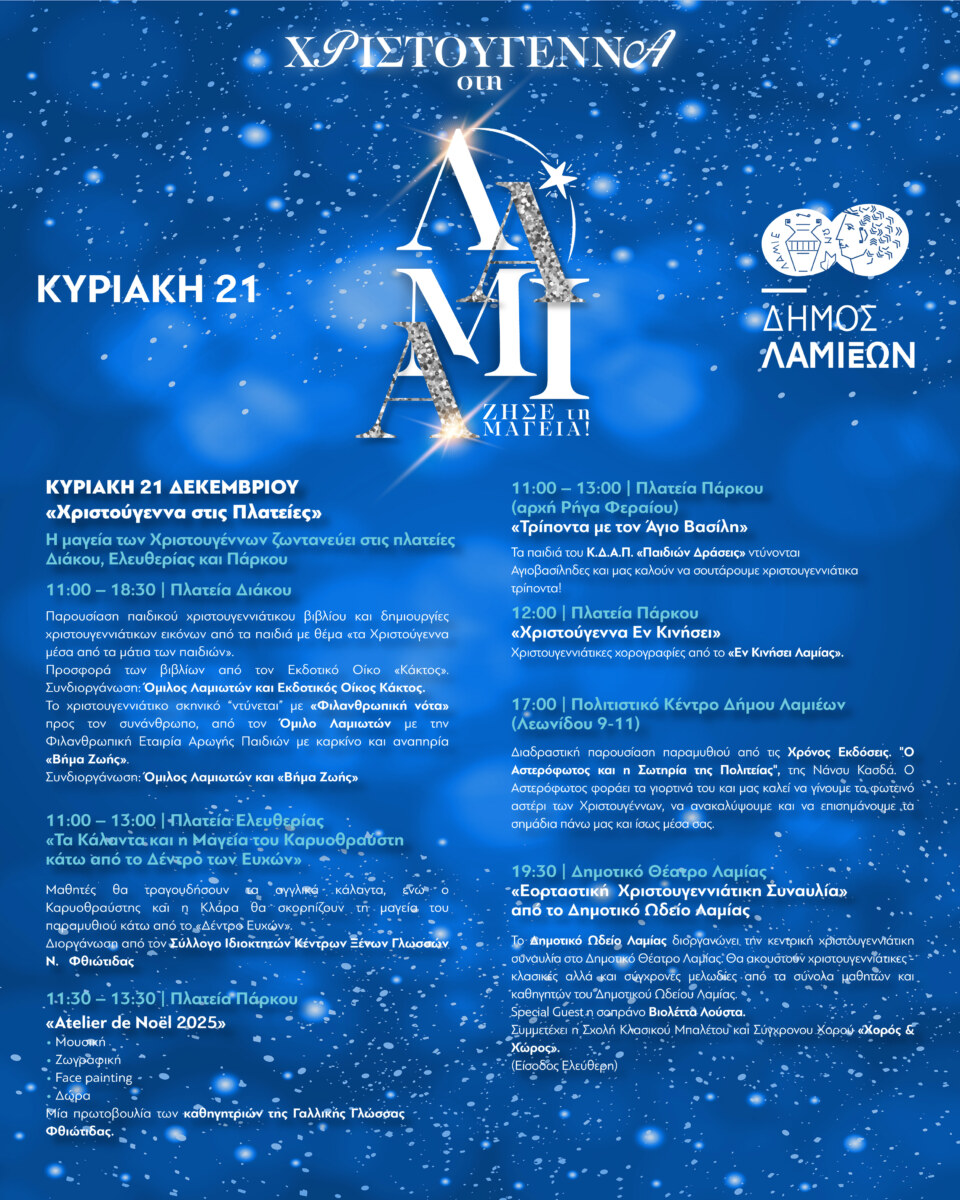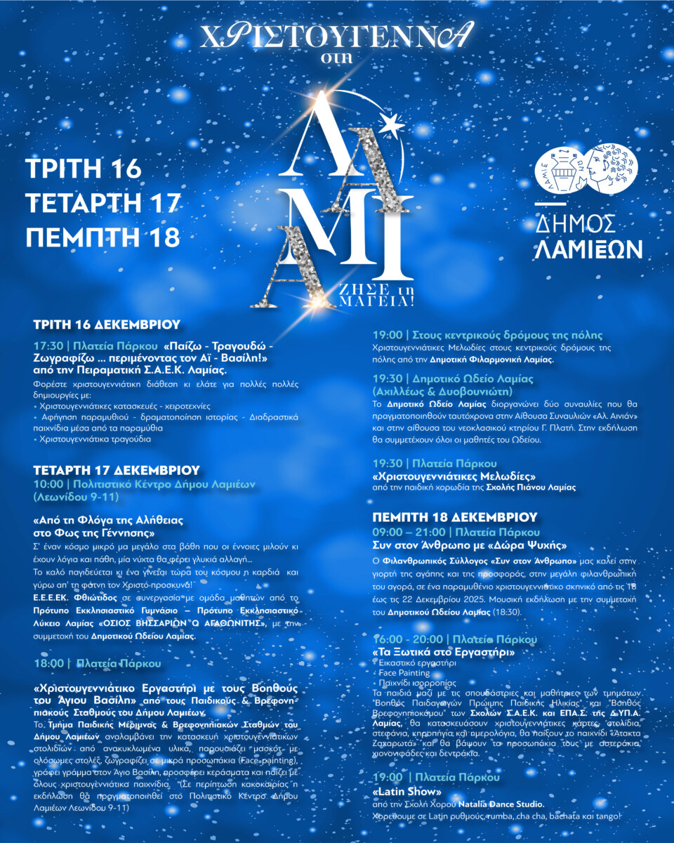 Δήμος Λαμιέων: Πρόγραμμα εορταστικών εκδηλώσεων για το διάστημα από 16 έως 21 Δεκεμβρίου