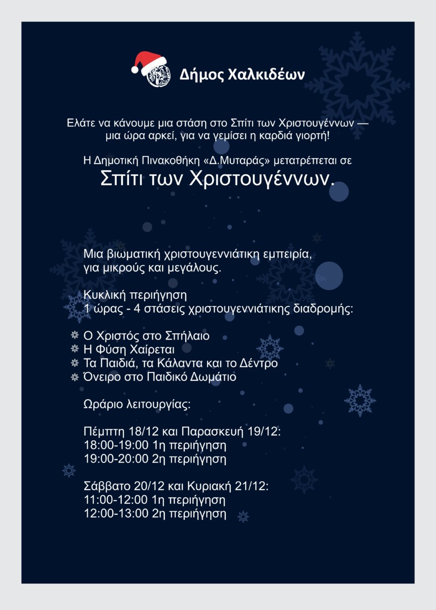Τα Χριστούγεννα πλησιάζουν και στον Δήμο Χαλκιδέων απέκτησαν το σπίτι τους. Η Δημοτική Πινακοθήκη «Δ.Μυταράς» μετατρέπεται στο «Σπίτι των Χριστουγέννων», έτοιμο να υποδεχτεί μικρούς και μεγάλους, προσφέροντας μια ξεχωριστή, βιωματική χριστουγεννιάτικη εμπειρία.