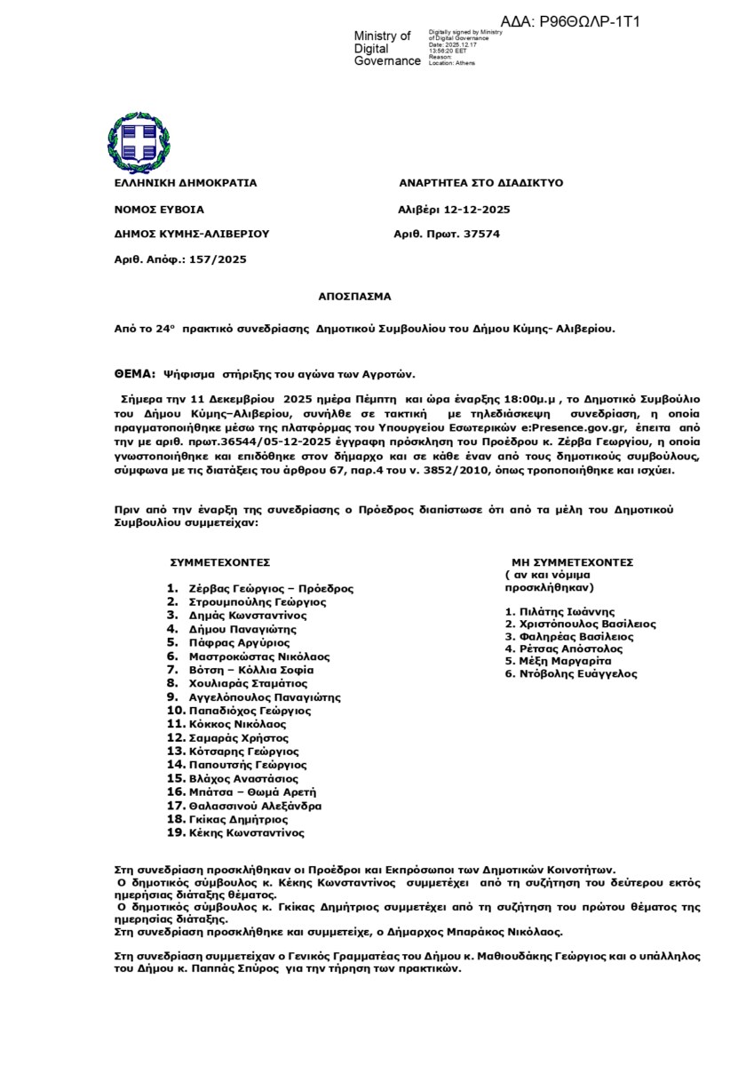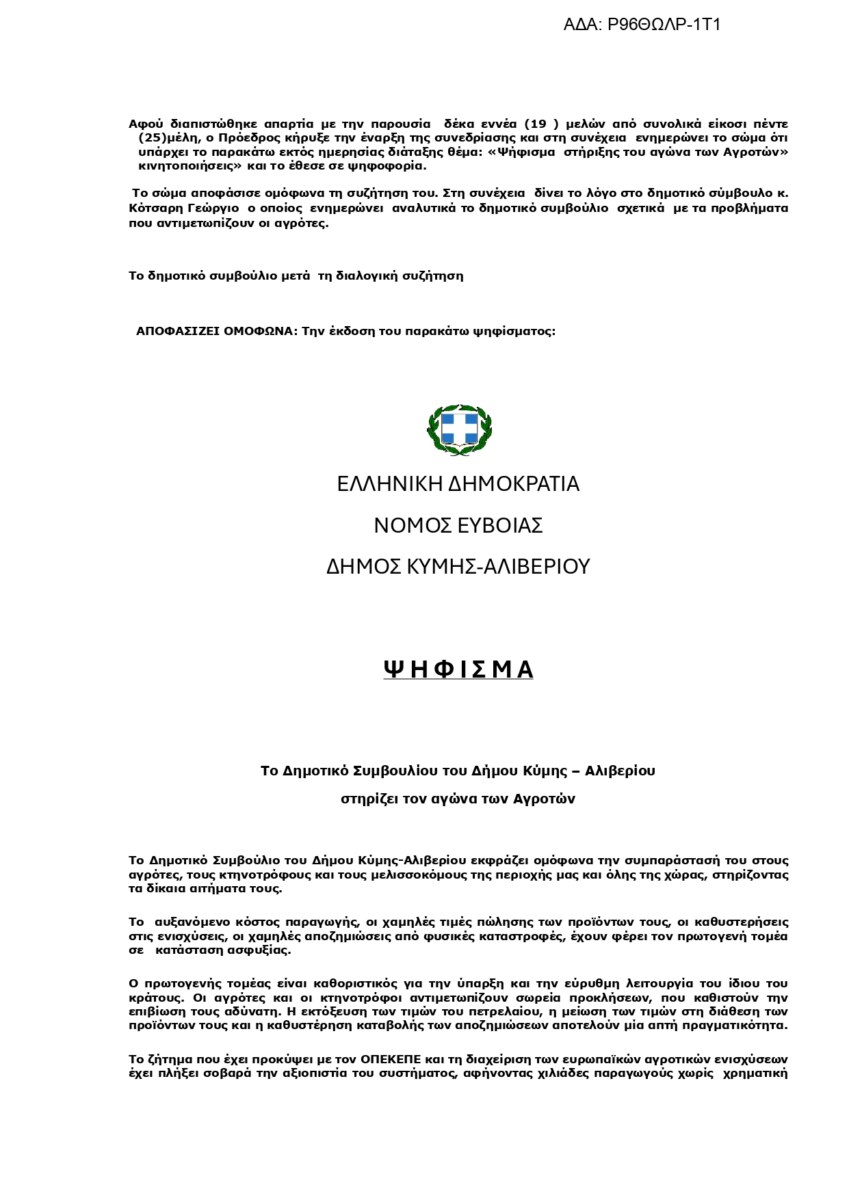 Ψήφισμα με το οποίο τάσσεται υπέρ του αγώνα των αγροτών εξέδωσε κατά την πρόσφατη συνεδρίαση του δημοτικού συμβουλίου ο Δήμος Κύμης – Αλιβερίου.