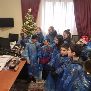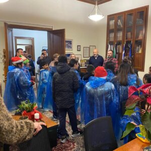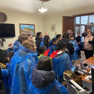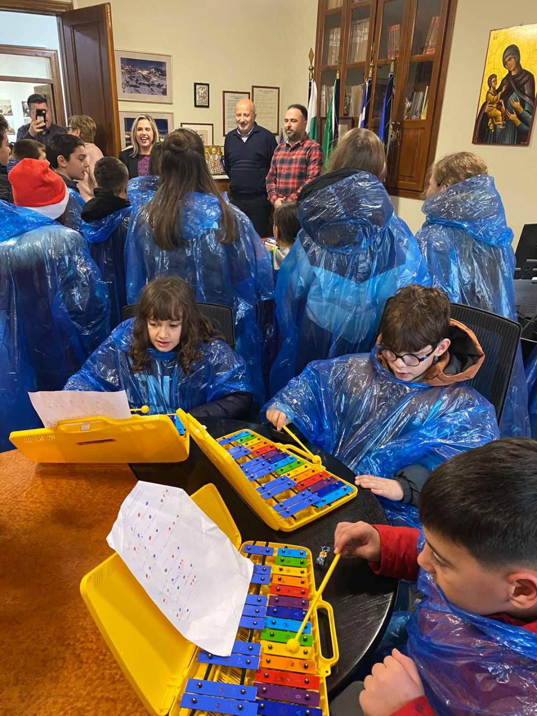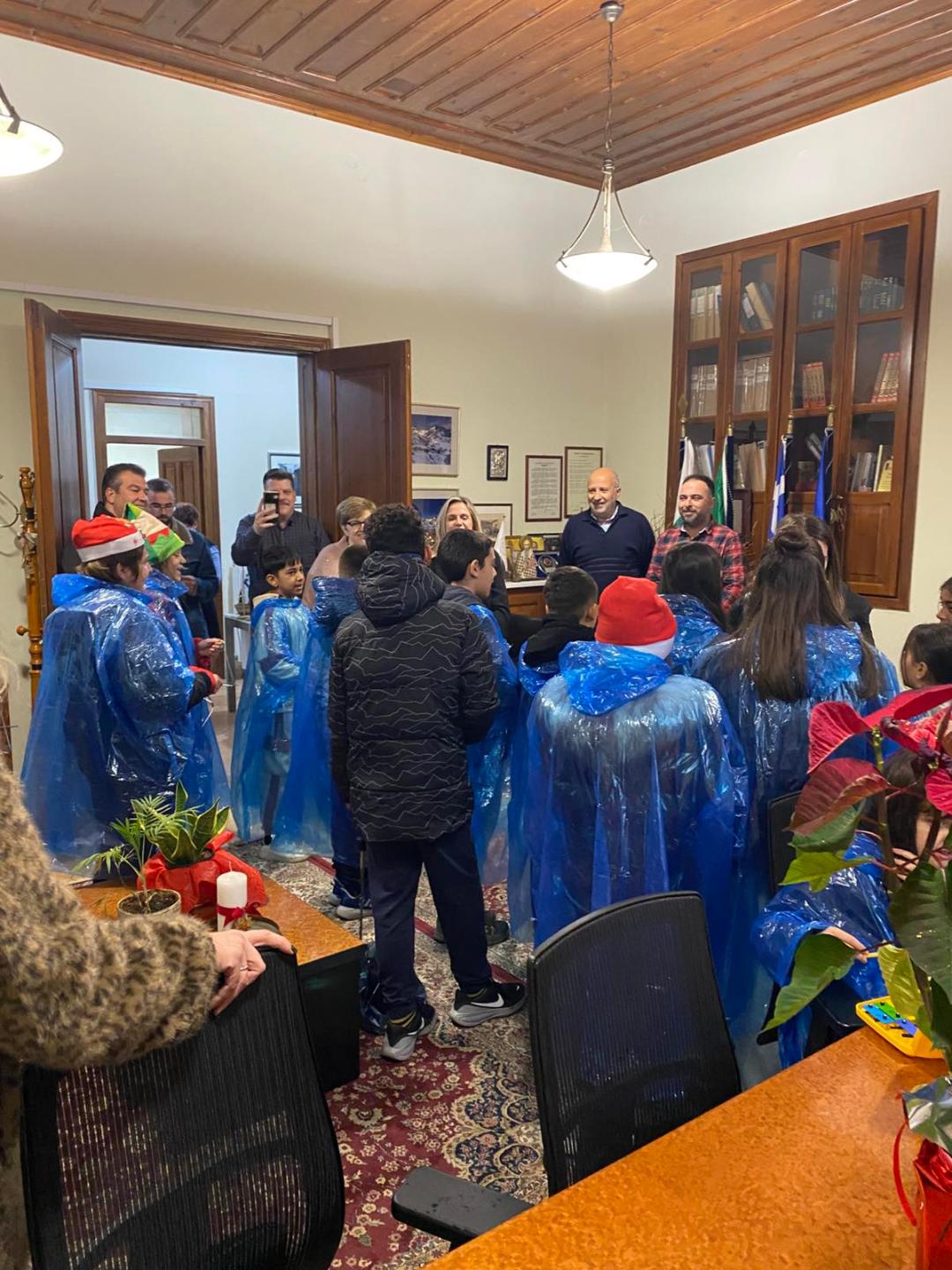 Οι μαθητές, αψηφώντας τις καιρικές συνθήκες με τα αδιάβροχά τους και κρατώντας τα μεταλλόφωνά τους, τήρησαν τα έθιμα των ημερών και έψαλαν τα παραδοσιακά κάλαντα των Χριστουγέννων. Οι μελωδικοί ήχοι των οργάνων και οι παιδικές φωνές έφτασαν σε κάθε γραφείο, μεταφέροντας το μήνυμα της γέννησης του Θεανθρώπου στους αιρετούς εκπροσώπους της Τοπικής Αυτοδιοίκησης και στους υπαλλήλους των υπηρεσιών.