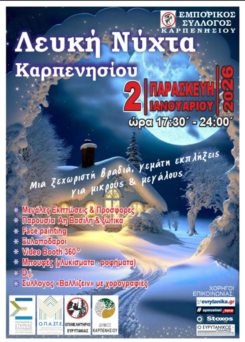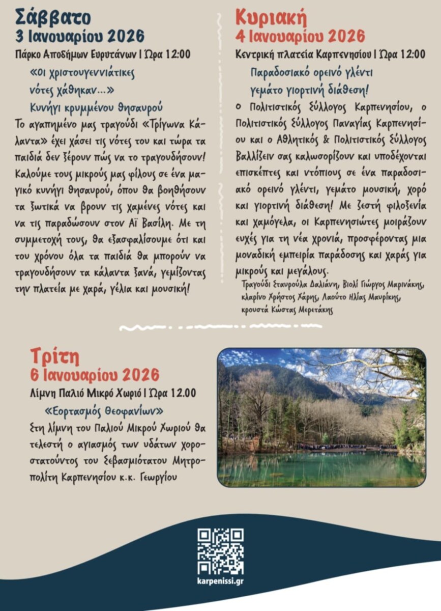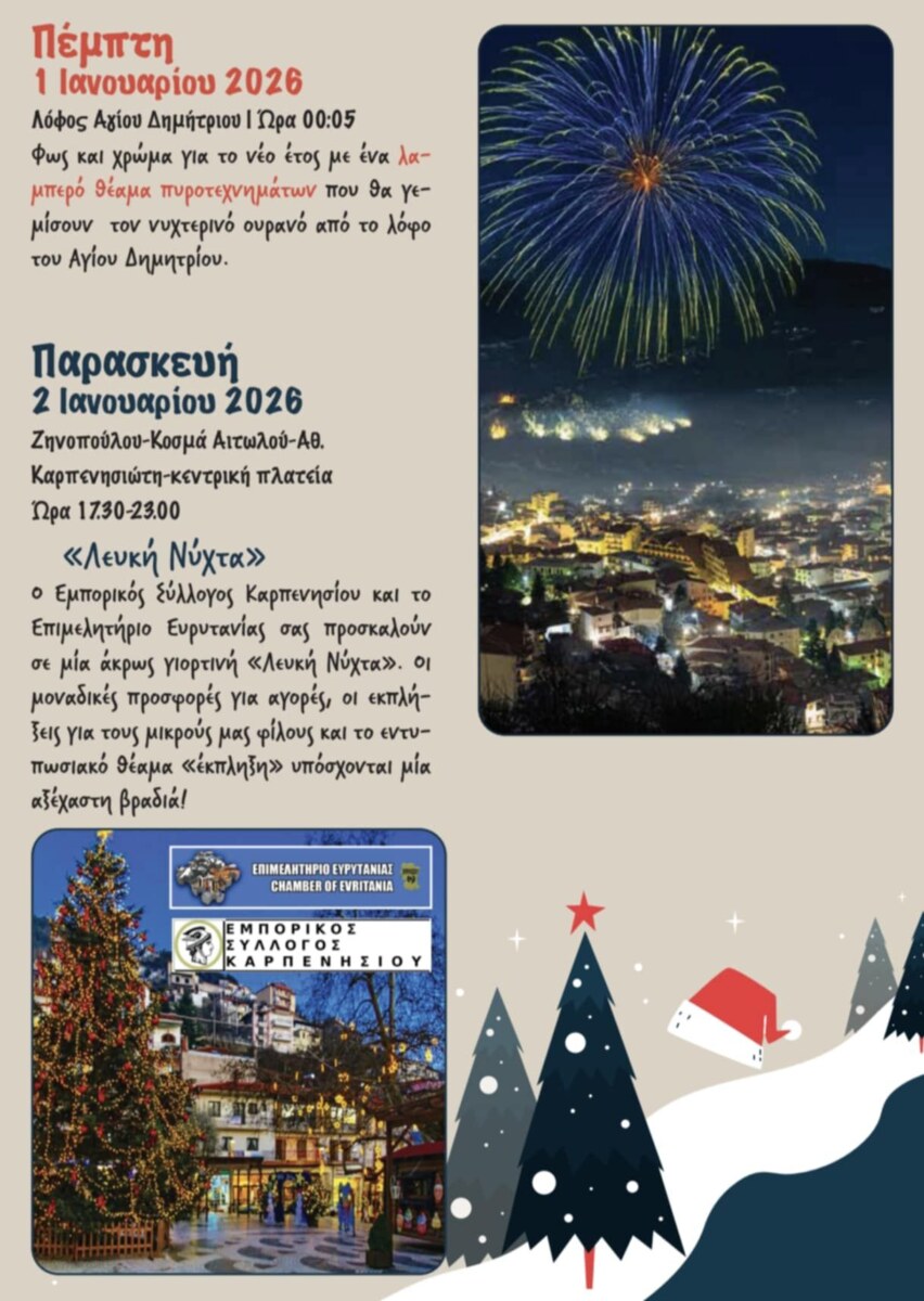 Έως τις 6 Ιανουαρίου 2026 συνεχίζονται οι εορταστικές εκδηλώσεις του Δήμου Καρπενησίου.