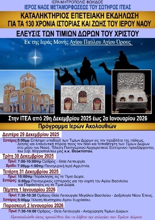 Τα Τίμια Δώρα θα παραμείνουν προς προσκύνηση στον Ιερό Ναό Μεταμορφώσεως του Σωτήρος Ιτέας έως και τις 2 Ιανουαρίου 2026, αποτελώντας πηγή πνευματικής ευλογίας και ενίσχυσης για τους πιστούς της περιοχής και τους προσκυνητές.
