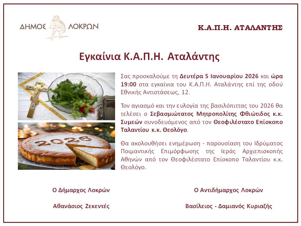 Τα εγκαίνια του ΚΑΠΗ Αταλάντης θα τελέσει τη Δευτέρα 5 Ιανουαρίου 2026 στις 19:00 ο Σεβασμιώτατος Μητροπολίτης Φθιώτιδας κ.κ. Συμεών.