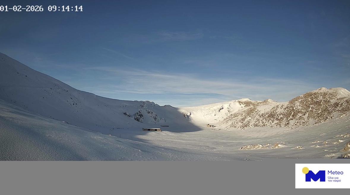 Στη φωτογραφία απεικονίζεται ο χιονισμένος Παρνασσός από την κάμερα του μετεωρολογικού σταθμού του meteo.gr στο Σέσι Παρνασσού.