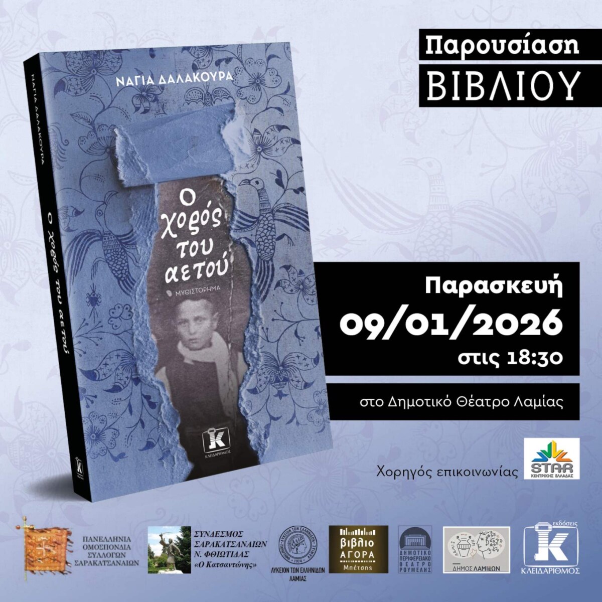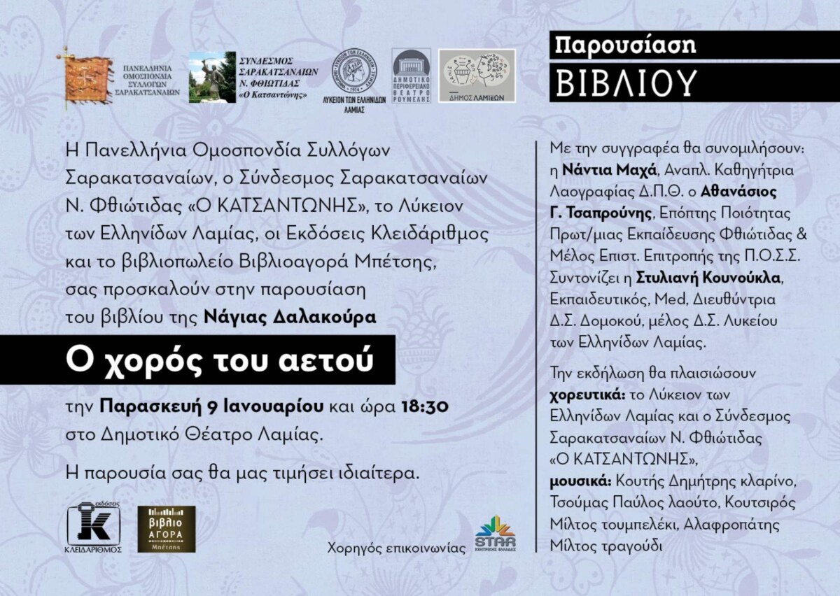 Η Πανελλήνια Ομοσπονδία Συλλόγων Σαρακατσαναίων, ο Σύνδεσμος Σαρακατσαναίων Ν. Φθιώτιδας «Ο ΚΑΤΣΑΝΤΩΝΗΣ», το Λύκειον των Ελληνίδων Λαμίας, οι Εκδόσεις Κλειδάριθμος και το βιβλιοπωλείο Βιβλιοαγορά Μπέτσης, σας προσκαλούν στην παρουσίαση του βιβλίου της Νάγιας Δαλακούρα: «Ο Χορός του Αετού» την Παρασκευή 9 Ιανουαρίου στις 18:30 στο Δημοτικό Θέατρο Λαμίας.