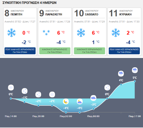 Σύμφωνα με την πρόβλεψη του meteo.gr η χιονόπτωση θα συνεχιστεί έως το βράδυ της Πέμπτης ενώ αναμένεται τσουχτερό κρύο με τη θερμοκρασία να πέφτει στους (-2 ) βαθμούς.