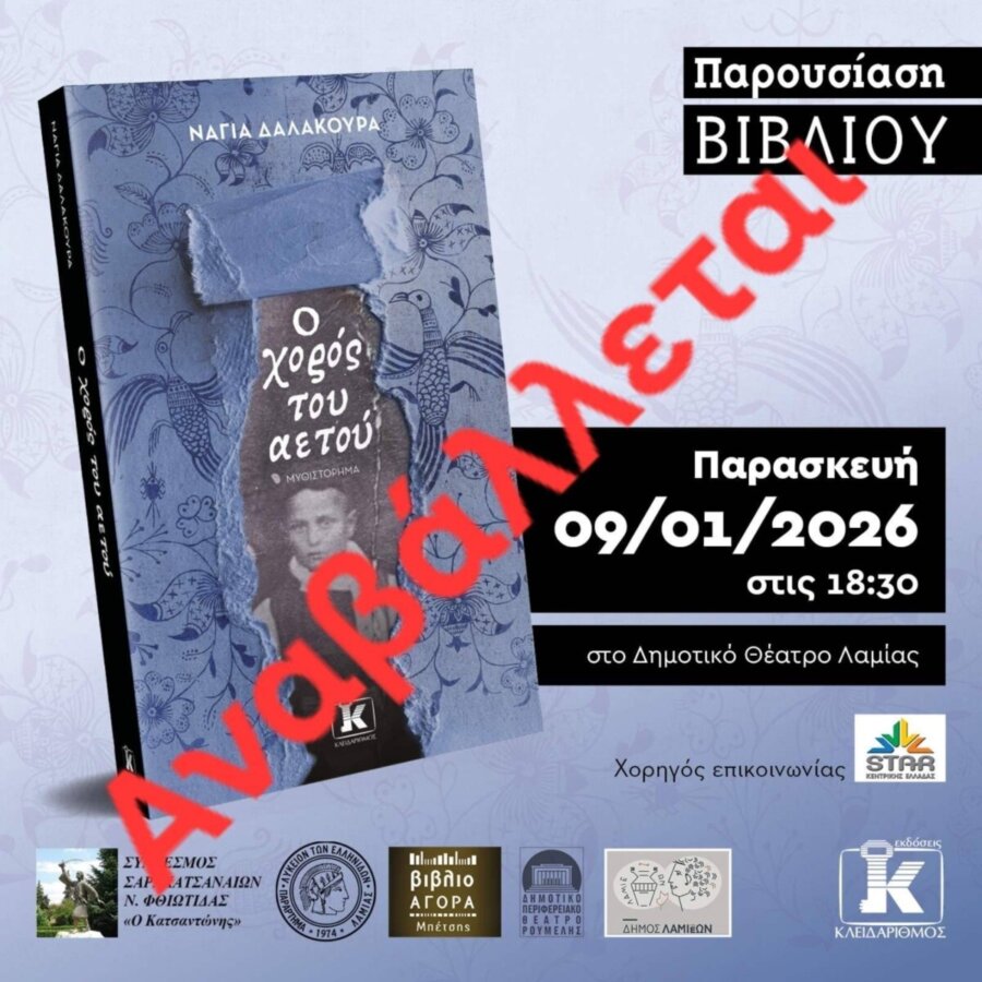 Η Πανελλήνια Ομοσπονδία Συλλόγων Σαρακατσαναίων (Π.Ο.Σ.Σ.), ο Σύνδεσμος Σαρακατσαναίων Νομού Φθιώτιδας «Ο Κατσαντώνης» και το Λύκειον των Ελληνίδων Λαμίας, θα θέλαμε να ενημερώσουμε τους συμπολίτες μας, ότι, λόγω των εκτεταμένων αγροτικών κινητοποιήσεων του επόμενου διημέρου, η προγραμματισμένη για την Παρασκευή 9 Ιανουαρίου 2026 παρουσίαση βιβλίου, στο Δημοτικό Θέατρο Λαμίας, ΑΝΑΒΑΛΛΕΤΑΙ, καθώς είναι αδύνατη η μετακίνηση των εκτός Λαμίας βασικών συντελεστών της εκδήλωσης.