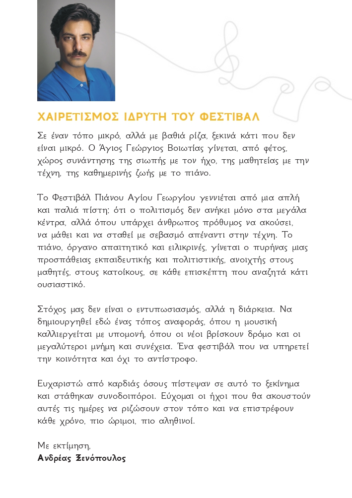 Το φεστιβάλ πραγματοποιείται με τη στήριξη του Δήμου Λεβαδέων και της Κοινότητας Αγίου Γεωργίου, σε παραγωγή του Piano Plus Festival, και φιλοδοξεί να φέρει την υψηλού επιπέδου μουσική δημιουργία στον τόπο, έξω από τα μεγάλα αστικά κέντρα, με έμφαση στην παιδεία, τη συνέχεια και τη ζωντανή επαφή κοινού και καλλιτεχνών.