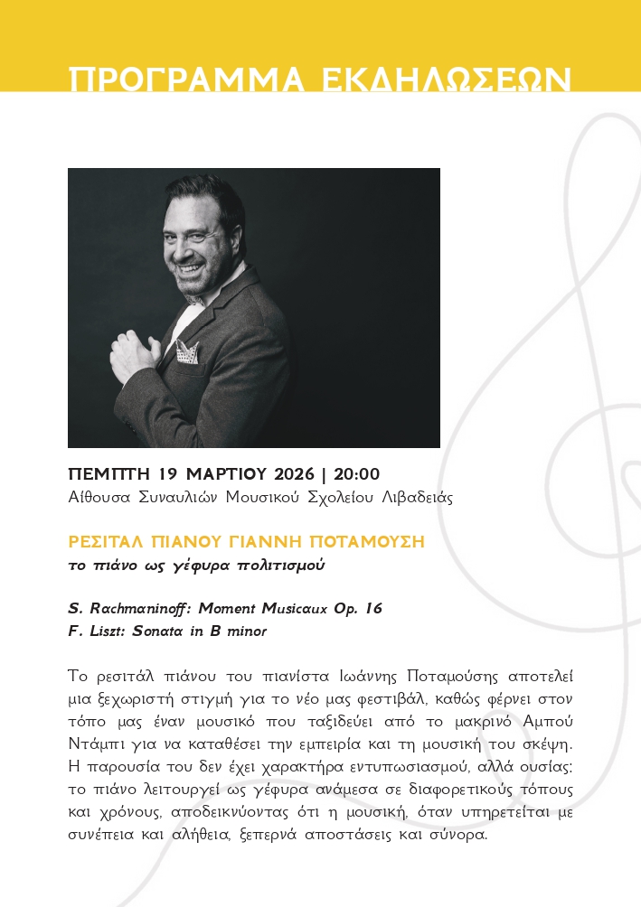 Στο πλαίσιο του φεστιβάλ θα παρουσιαστούν ρεσιτάλ και μουσικές βραδιές με τους: