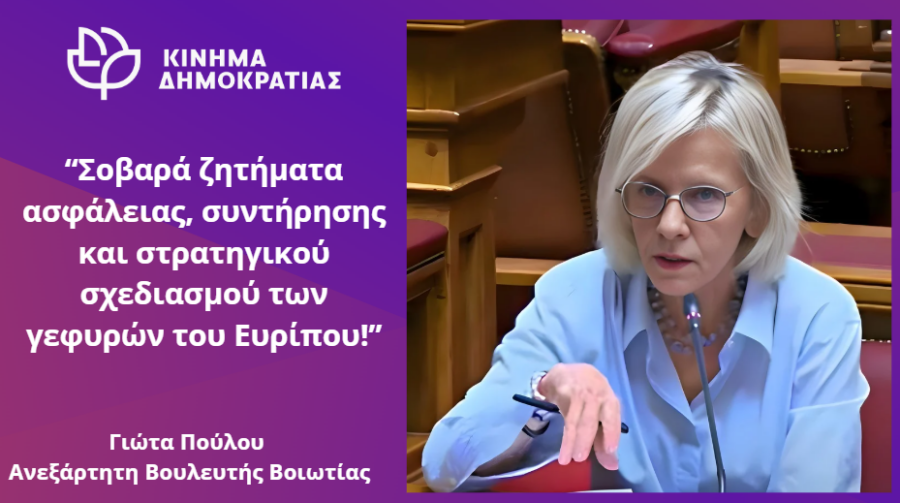 Με Ερώτηση και Αίτηση Κατάθεσης Εγγράφων που κατέθεσα σήμερα στη Βουλή προς τους Υπουργούς Ναυτιλίας και Νησιωτικής Πολιτικής, Υποδομών και Μεταφορών και Εσωτερικών, μαζί με τους Βουλευτές μέλη του Κινήματος Δημοκρατίας, αναδεικνύουμε τα σοβαρά προβλήματα ασφάλειας και συντήρησης στις γέφυρες του Ευρίπου, που απειλούν την καθημερινή ζωή, την οικονομία και την ασφάλεια της Εύβοιας.
