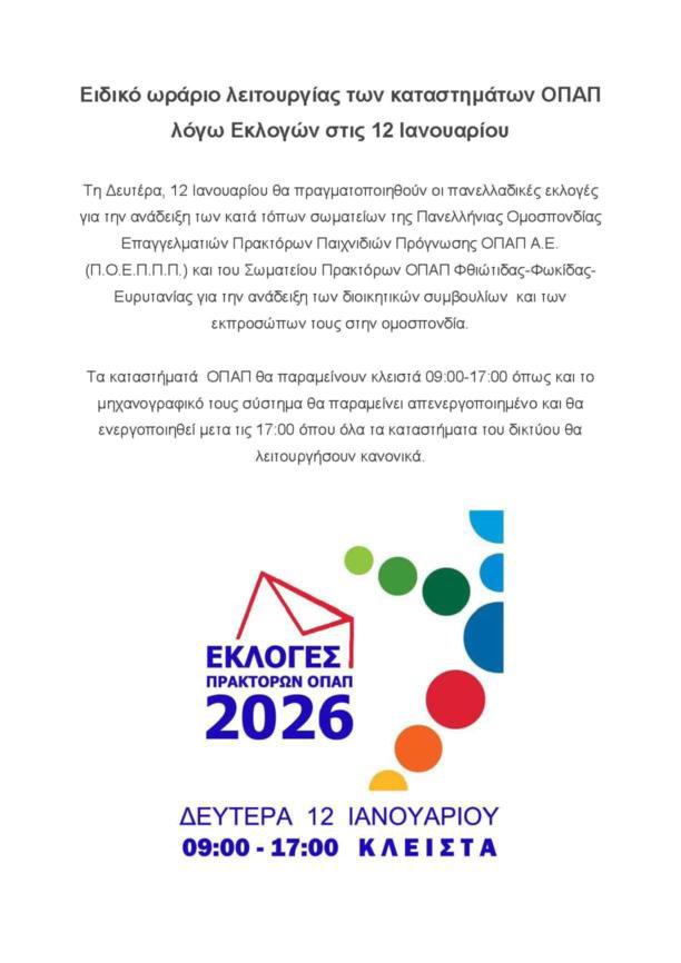 Η τροποποίηση στις ώρες λειτουργίας γίνεται λόγω των πανελλαδικών εκλογών για την ανάδειξη των κατά τόπων σωματείων της Πανελλήνιας Ομοσπονδίας Επαγγελματιών Πρακτόρων Παιχνιδιών Πρόγνωσης ΟΠΑΠ ΑΕ και του Σωματείου Πρακτόρων ΟΠΑΠ Φθιώτιδας – Φωκίδας – Ευρυτανίας για την ανάδειξη των διοικητικών συμβουλίων και των εκπροσώπων τους στην Ομοσπονδία.