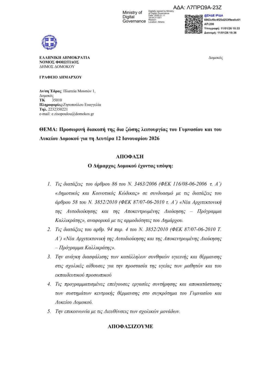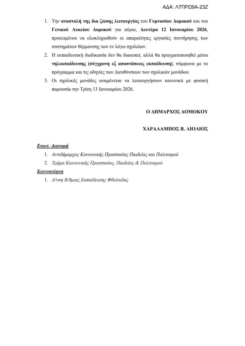 Κλειστά θα παραμείνουν τη Δευτέρα 12 Ιανουαρίου τα σχολεία στο Δήμο Δομοκού, με απόφαση του Δημάρχου.