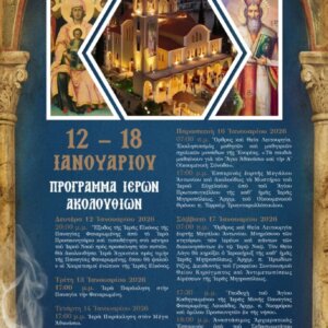 ΠΡΟΓΡΑΜΜΑ ΙΕΡΩΝ ΑΚΟΛΟΥΘΙΩΝ 12 – 18 Ἰανουαρίου 2026