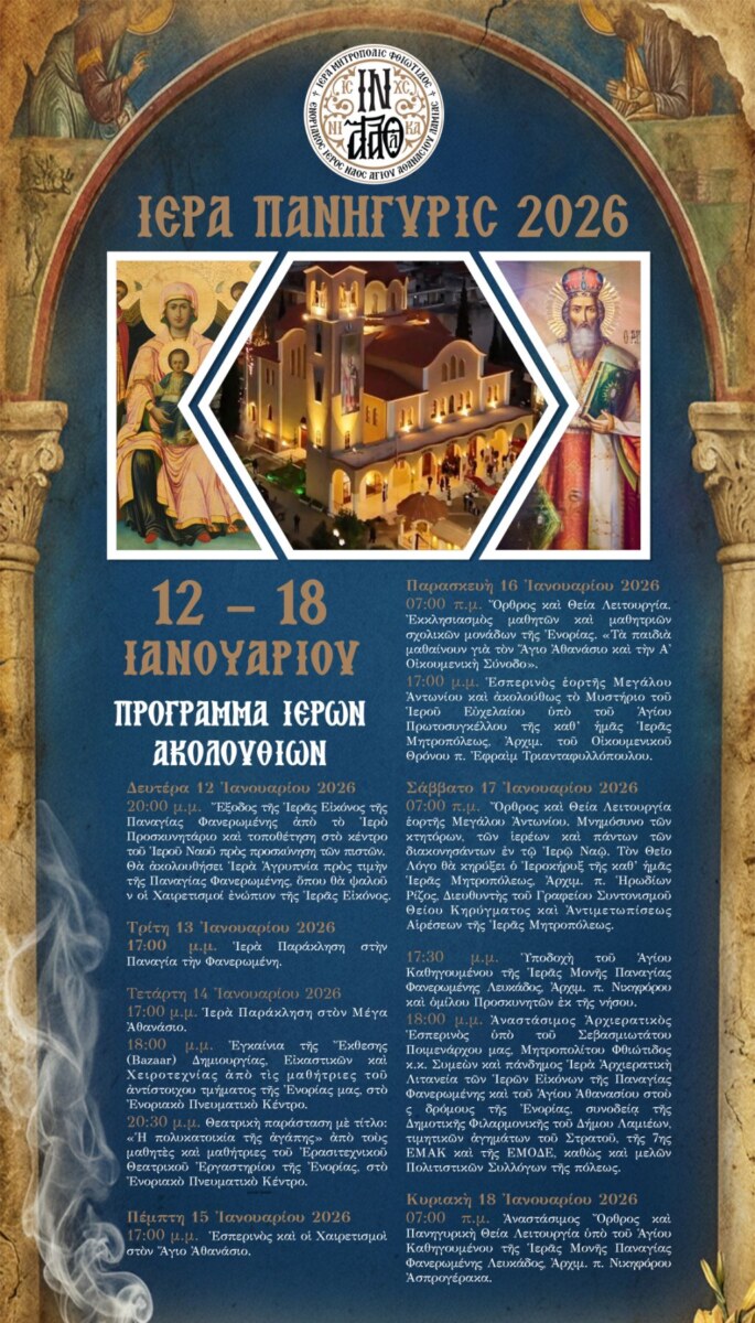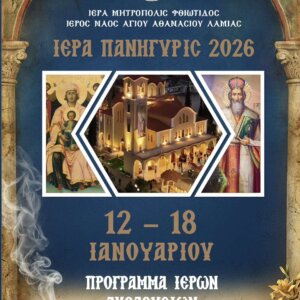 Ο Ιερός Ναός Αγίου Αθανασίου στα Γαλανέικα Λαμίας καλεί τους πιστούς στις Ιερές Ακολουθίες της εορτής του Αγίου Αθανασίου από τις 12 έως τις 18 Ιανουαρίου 2026.