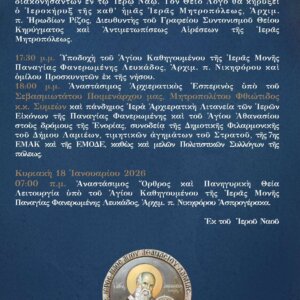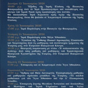 Ἡ φετινὴ Ἱερὰ Πανήγυρις θὰ ἑορτασθεῖ ἀπὸ τὶς 12 ἕως τὶς 18 Ἰανουαρίου 2026, κατὰ τὸ ἀκόλουθο πρόγραμμα: