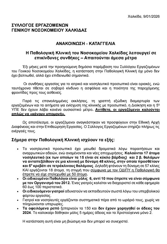 Θέμα: Επικίνδυνες συνθήκες λειτουργίας στην Παθολογική Κλινική του Γενικού Νοσοκομείου Χαλκίδας