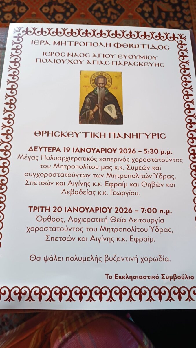Με τρεις Μητροπολίτες θα εορταστεί ο πολιούχος της Αγίας Παρασκευής του δήμου Αμφίκλειας – Ελάτειας Άγιος Ευθύμιος