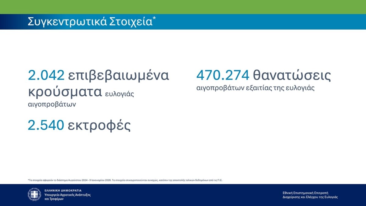 Το Υπουργείο Αγροτικής Ανάπτυξης και Τροφίμων και η Εθνική Επιστημονική Επιτροπή Διαχείρισης και Ελέγχου της ευλογιάς των αιγοπροβάτων δίνουν σήμερα στη δημοσιότητα επικαιροποιημένα συγκεντρωτικά στοιχεία για την πορεία της νόσου στη χώρα, όπως προκύπτουν από τα δεδομένα των Κτηνιατρικών Υπηρεσιών.