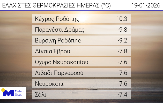 Το πολικό ψύχος έγινε αισθητό σε ορεινές και ημιορεινές περιοχές. Οι χαμηλότερες θερμοκρασίες καταγράφηκαν στα βορειοανατολικά, απ’ όπου εισέρχονται οι ψυχρές αέριες μάζες. Ενδεικτικά, στο Κέχρος Ροδόπης το θερμόμετρο έπεσε στους -10,3 βαθμούς Κελσίου, ενώ ισχυρός παγετός σημειώθηκε νωρίς το πρωί σε πολλές περιοχές της Βόρειας Ελλάδας.