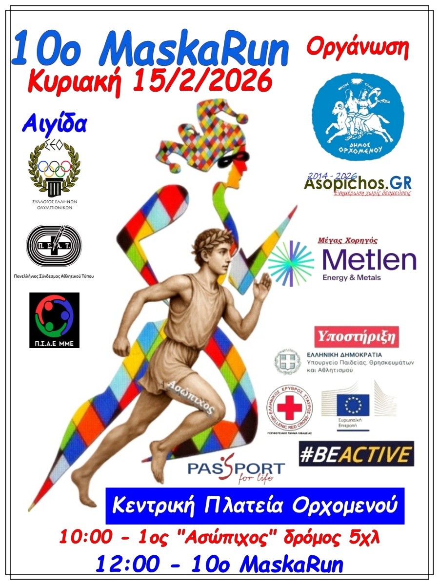 Την Κυριακή 15 Φεβρουαρίου 2026, ο Ορχομενός αναβιώνει την αθλητική του δόξα. Ο 1ος Αγώνας Δρόμου 5χλμ «Ασώπιχος», αφιερωμένος στον Ορχομένιο Ολυμπιονίκη που εξύμνησε ο Πίνδαρος, ανοίγει τις πύλες του, προσκαλώντας δρομείς από όλη την Ελλάδα σε μια ιστορική διαδρομή.