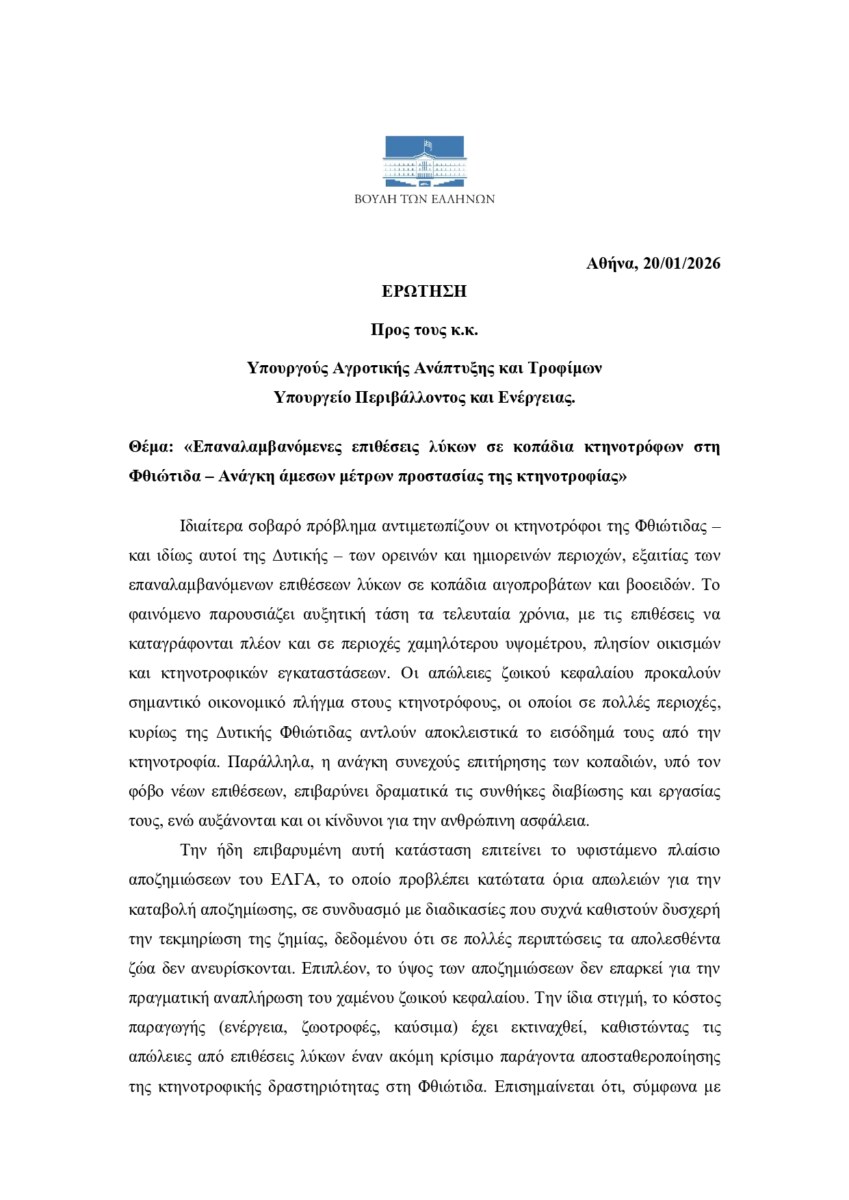 Την έντονη ανησυχία και αγανάκτηση των κτηνοτρόφων της Φθιώτιδας και κατά κύριο λόγο της Δυτικής, φέρνει με ερώτησή του προς τα Υπουργεία Αγροτικής Ανάπτυξης & Τροφίμων καθώς και Περιβάλλοντος & Ενέργειας, ο Βουλευτής Φθιώτιδας, Γιάννης Σαρακιώτης, για το θέμα των επαναλαμβανόμενων επιθέσεων λύκων σε κοπάδια αιγοπροβάτων.