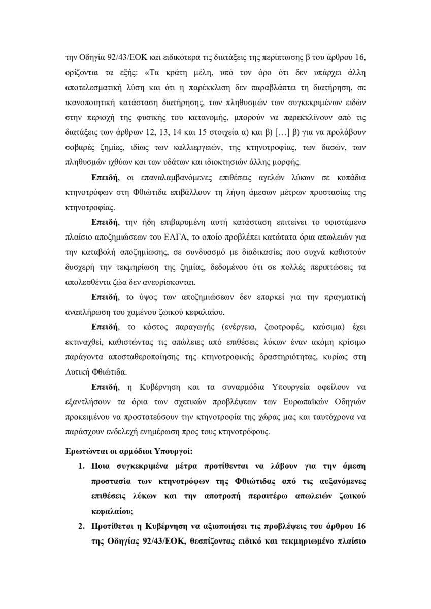Στην κοινοβουλευτική του παρέμβαση, ο Βουλευτής Φθιώτιδας κάνει μνεία στην ευρωπαϊκή νομοθεσία και συγκεκριμένα στο άρθρο 16 της Οδηγίας 92/43/ΕΟΚ το οποίο δίνει τη δυνατότητα στα Κράτη – Μέλη να λαμβάνουν ειδικά και τεκμηριωμένα μέτρα για την πρόληψη σοβαρών ζημιών στην κτηνοτροφία, υπό συγκεκριμένες προϋποθέσεις. Παρ’ όλα αυτά, η Κυβέρνηση εμφανίζεται μέχρι σήμερα απρόθυμη να εξαντλήσει τα διαθέσιμα αυτά εργαλεία, αφήνοντας τους κτηνοτρόφους ουσιαστικά απροστάτευτους.