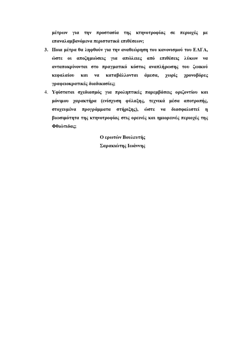 Επιπροσθέτως, όπως επισημαίνει ο Βουλευτής Φθιώτιδας, το πρόβλημα γίνεται ακόμη πιο ασφυκτικό εξαιτίας του ισχύοντος κανονισμού αποζημιώσεων του ΕΛΓΑ, ο οποίος θέτει κατώτατα όρια απωλειών και προβλέπει διαδικασίες που συχνά καθιστούν δυσχερή ή και αδύνατη την πλήρη τεκμηρίωση της ζημίας, δεδομένου ότι σε πολλές περιπτώσεις τα απολεσθέντα ζώα δεν ανευρίσκονται. Επιπλέον, οι καταβαλλόμενες αποζημιώσεις δεν ανταποκρίνονται στο πραγματικό κόστος αναπλήρωσης του ζωικού κεφαλαίου.