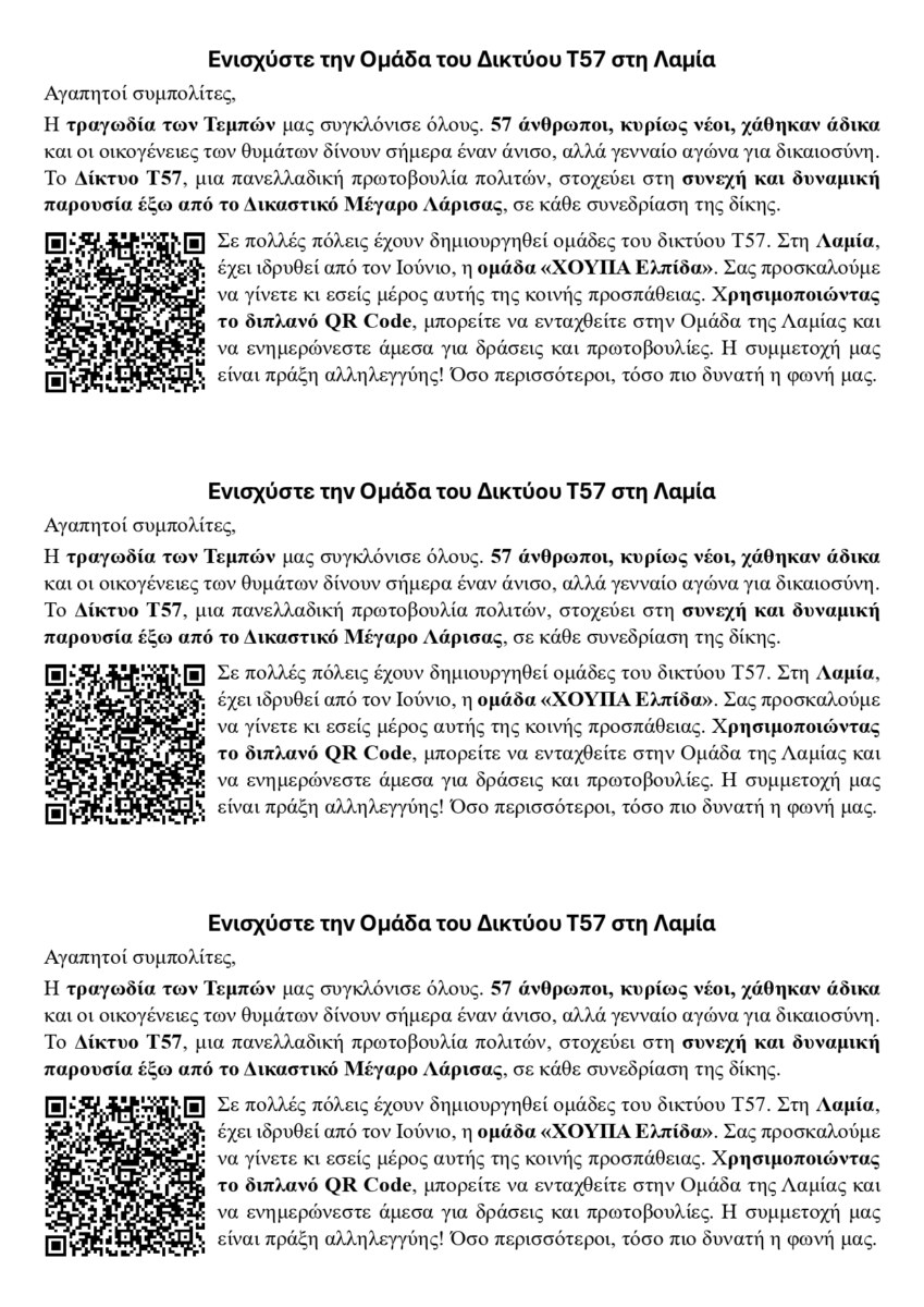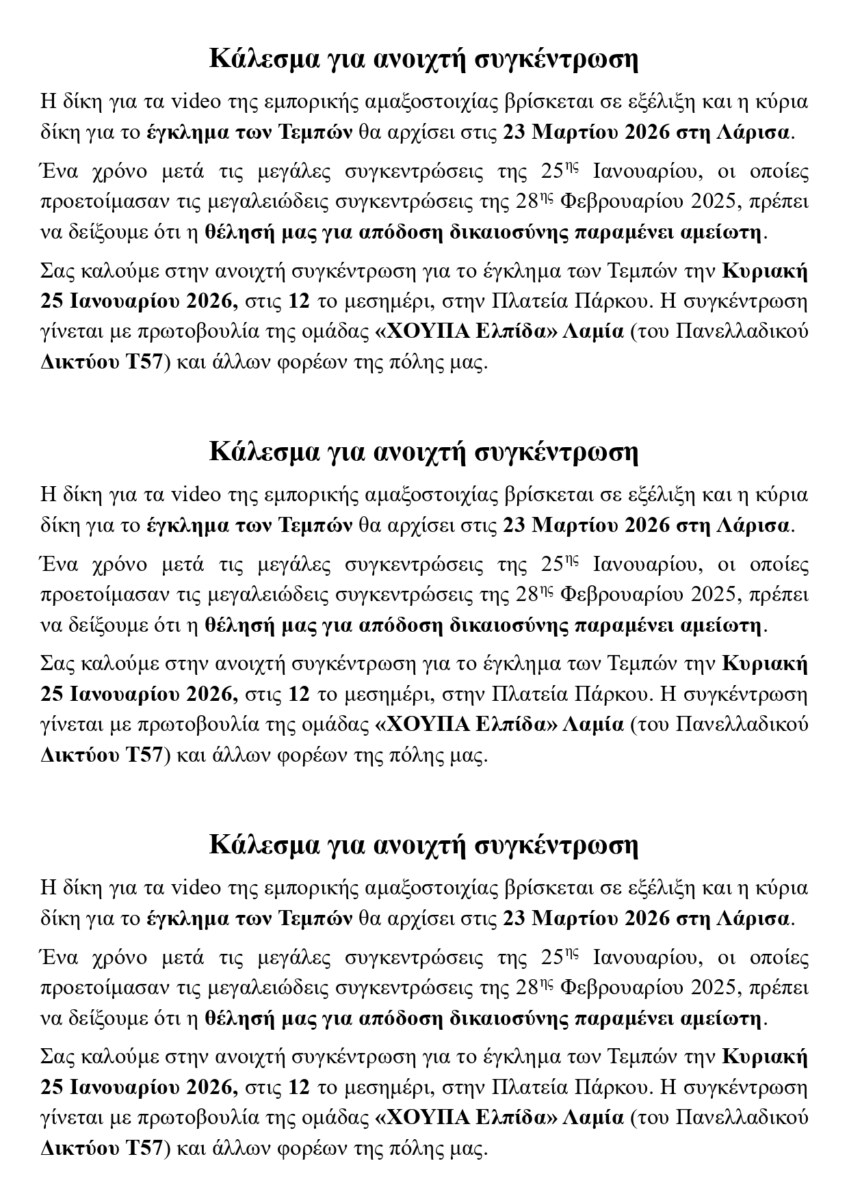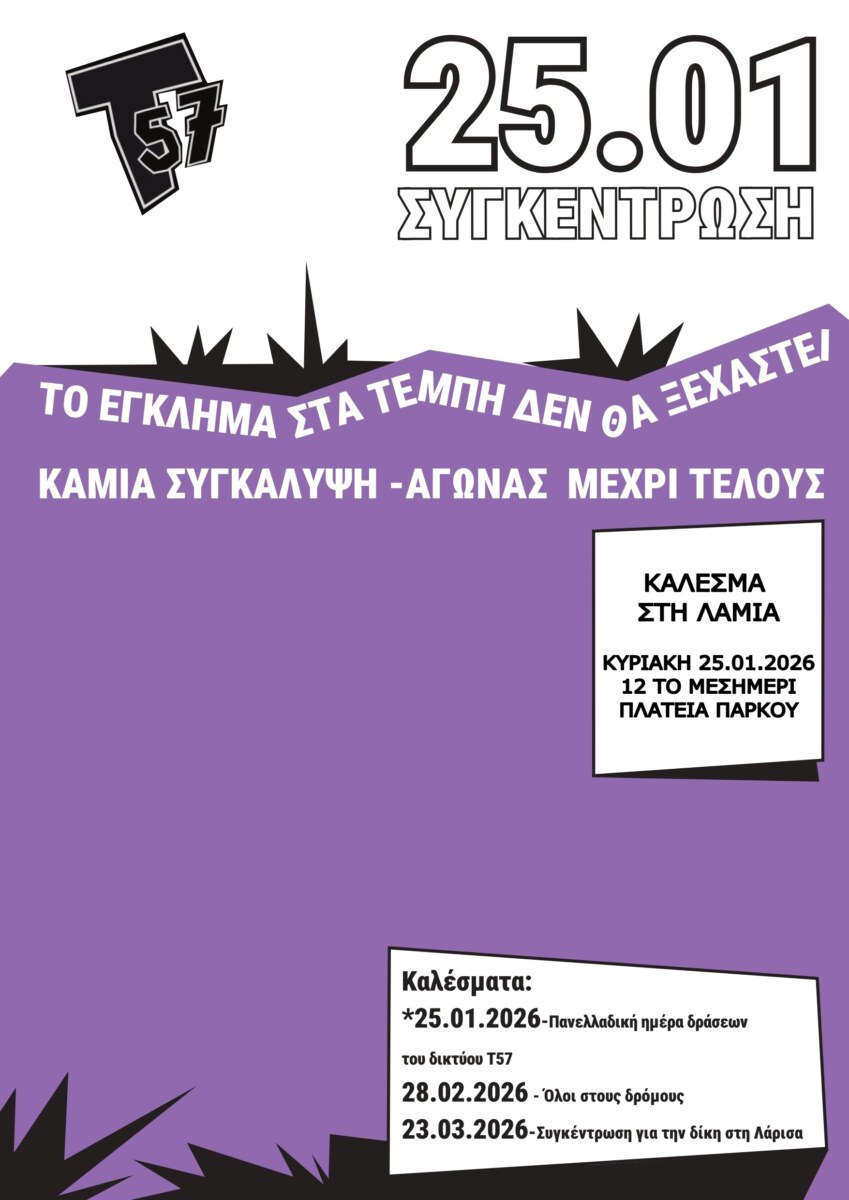2. Την Κυριακή 25 Ιανουαρίου 2026, ώρα 12 το μεσημέρι, ημέρα πανελλαδικής δράσης των ομάδων Τ57, σε συγκέντρωση-διαμαρτυρία στην Πλατεία Πάρκου στη Λαμία. Καλούμε τους φορείς της πόλης να συμμετέχουν και όλοι μαζί να καλέσουμε τους πολίτες της Λαμίας.